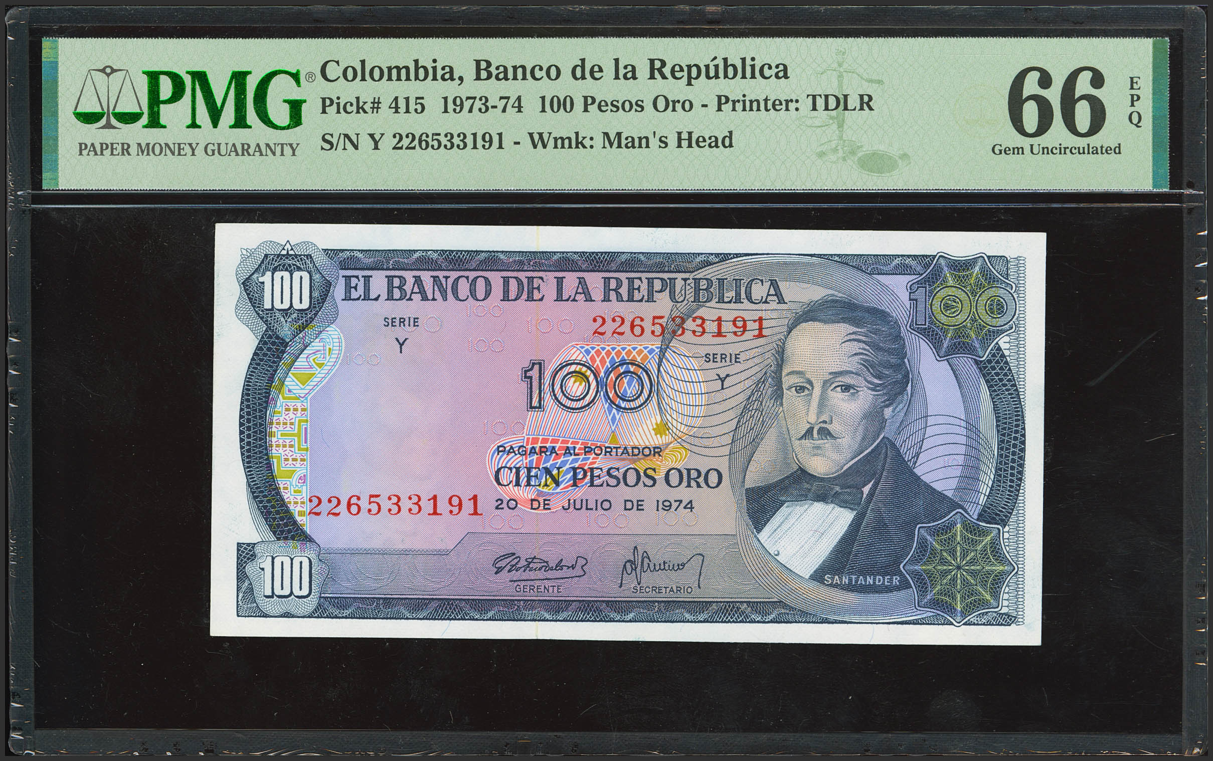 COLOMBIA. 100 Pesos. July 20, 1974. (Pick: 415). PMG66EPQ.