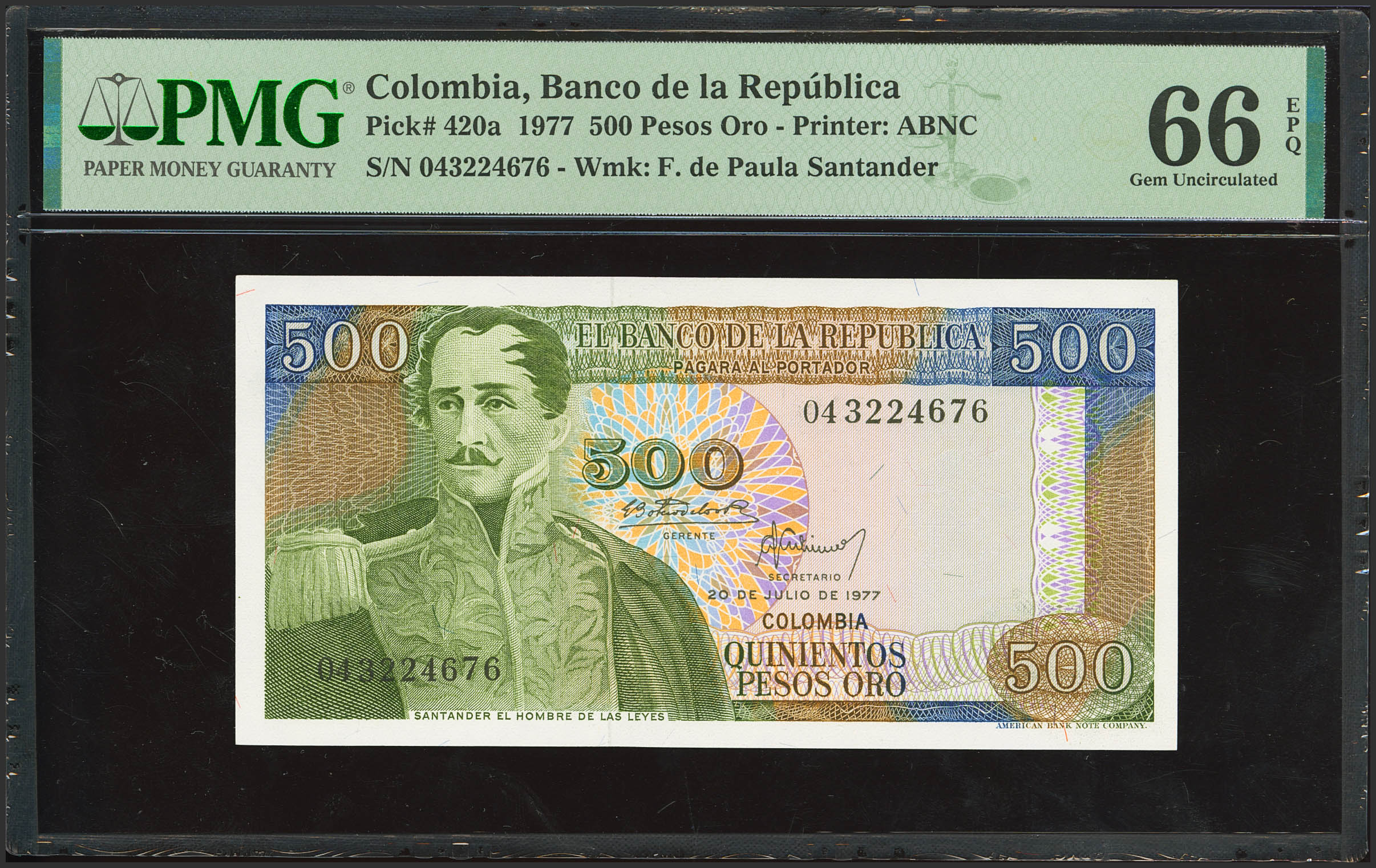 COLOMBIA. 500 Pesos. 20 July 1977. (Pick: 420a). PMG66EPQ.