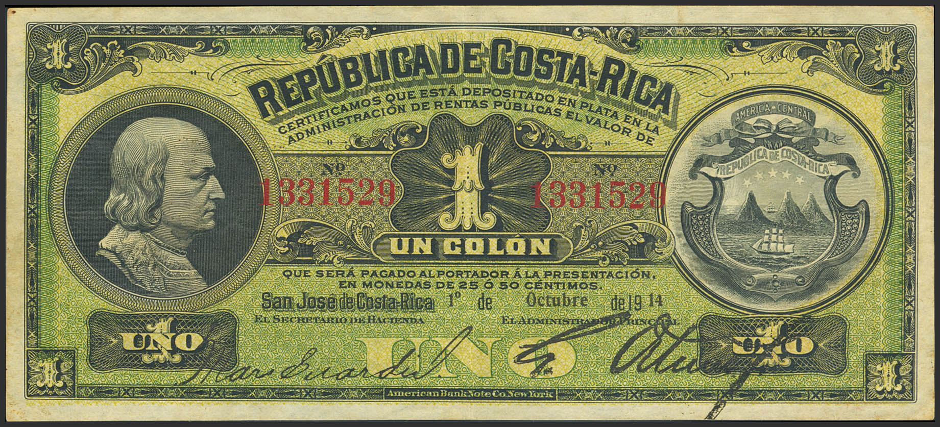 COSTA RICA. 1 Columbus. 1 October 1914. (Pick: 143). Very rare. Very Fine.