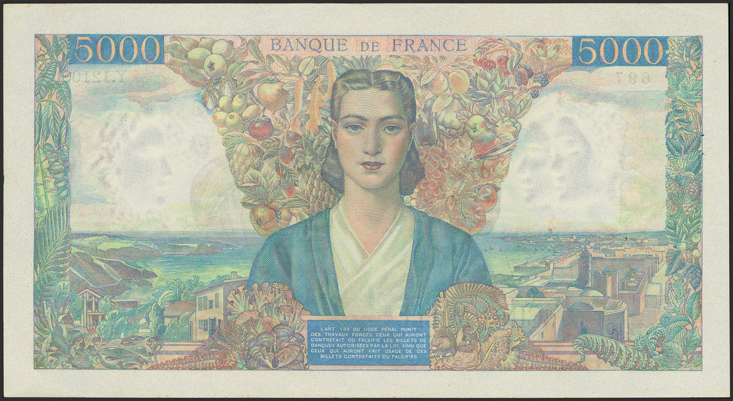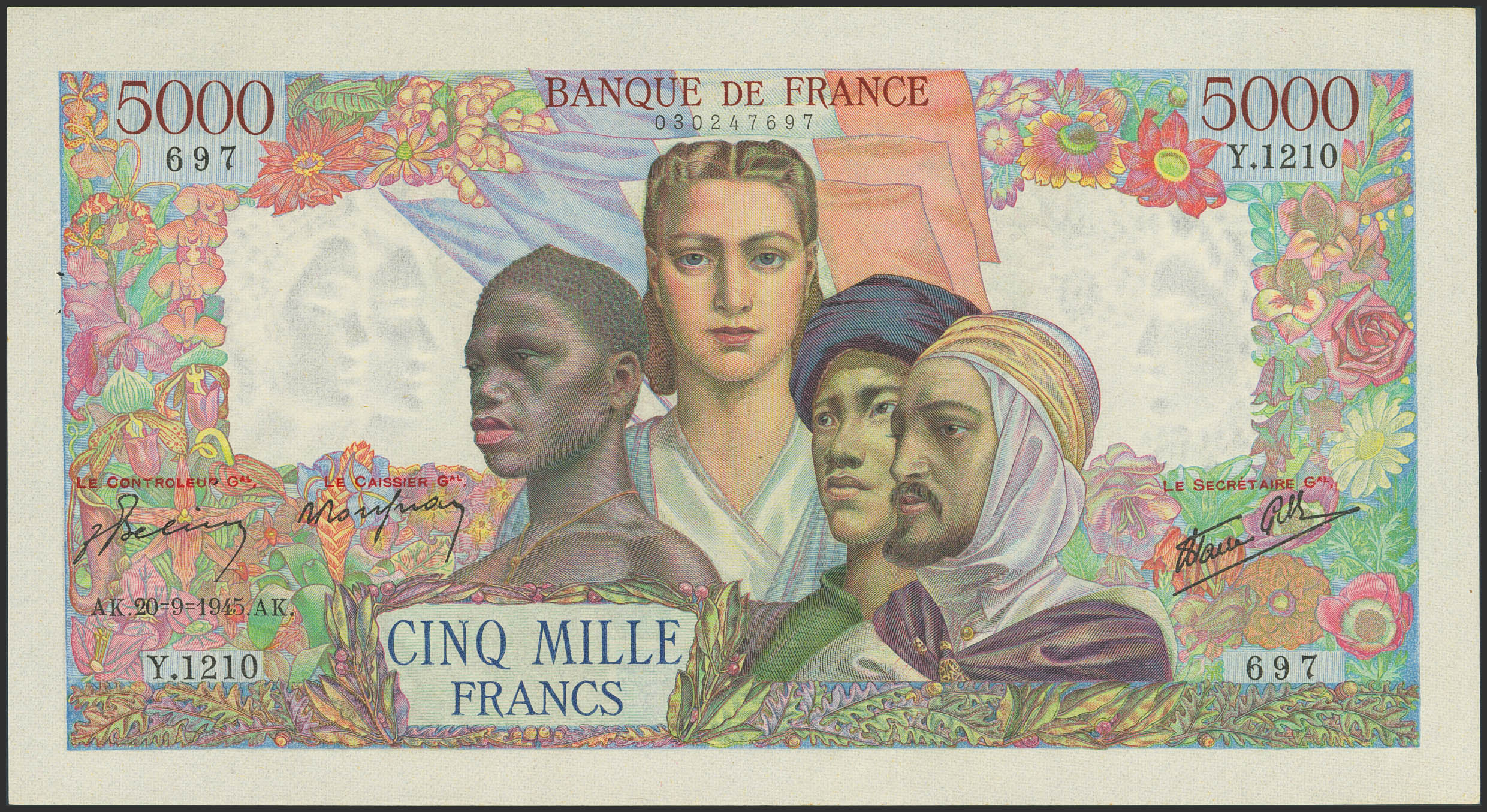 FRANCE. 5000 Francs. 20 September 1945. (Pick: 103). Unusual, in this quality, pinholes. About Uncirculated.