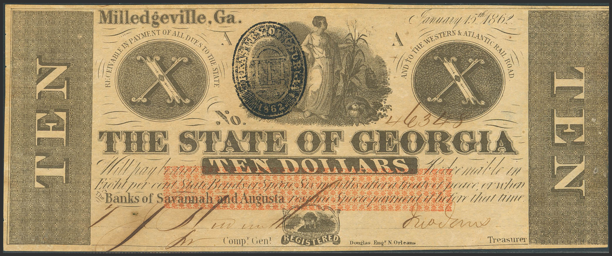 UNITED STATES (GEORGIA). 10 Dollars. 15 January 1862. (Pick: S853). Less than Extremely Fine.