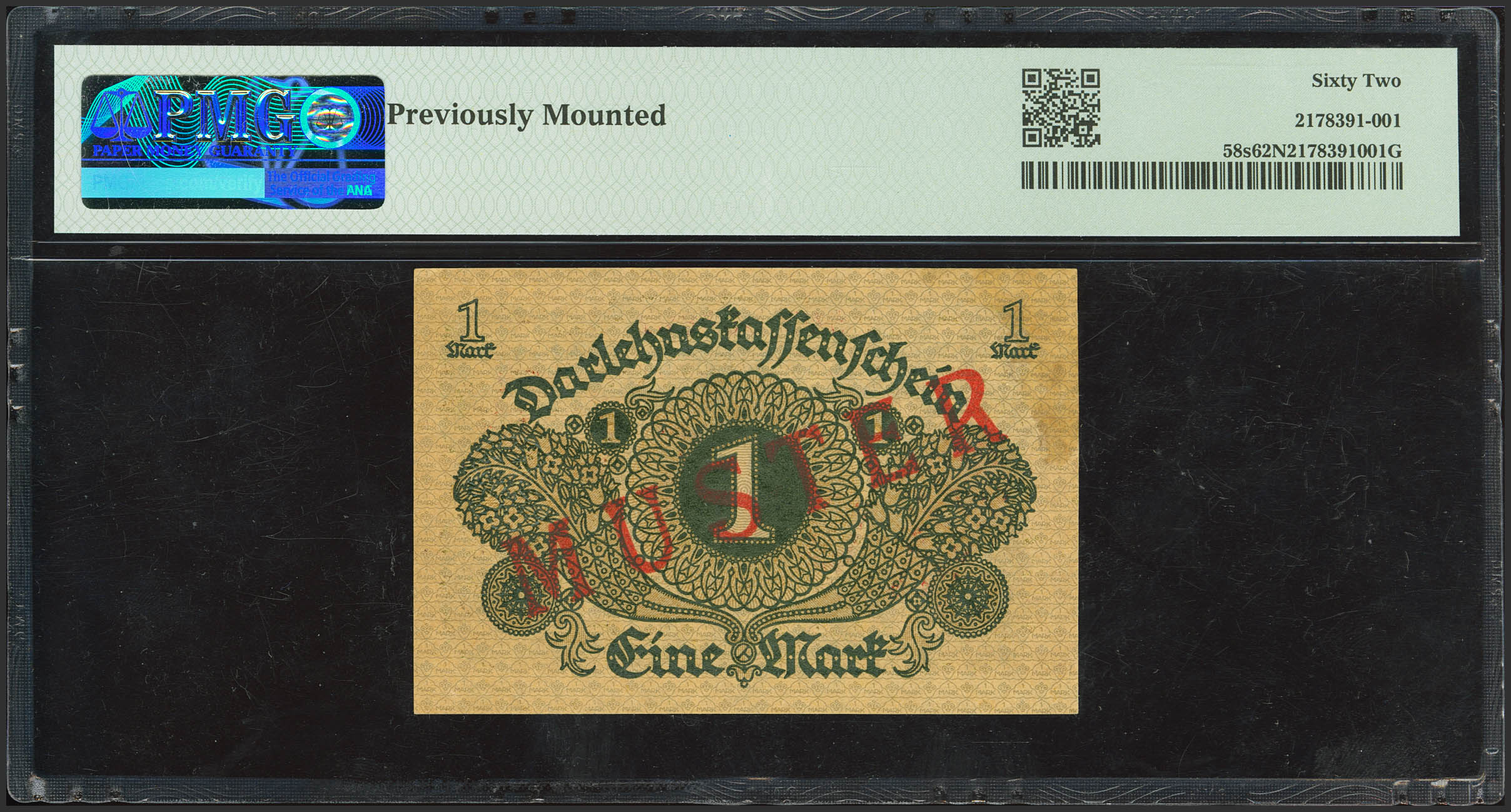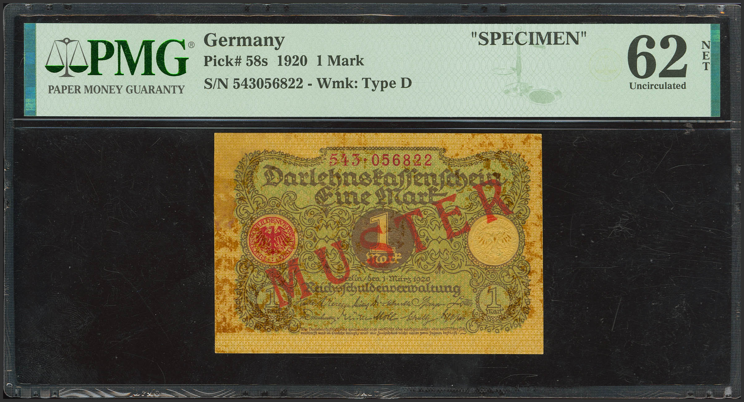 GERMANY. 1 Mark. 1920. Specimen. (Pick: 58s). PMG62NET (previously mounted).