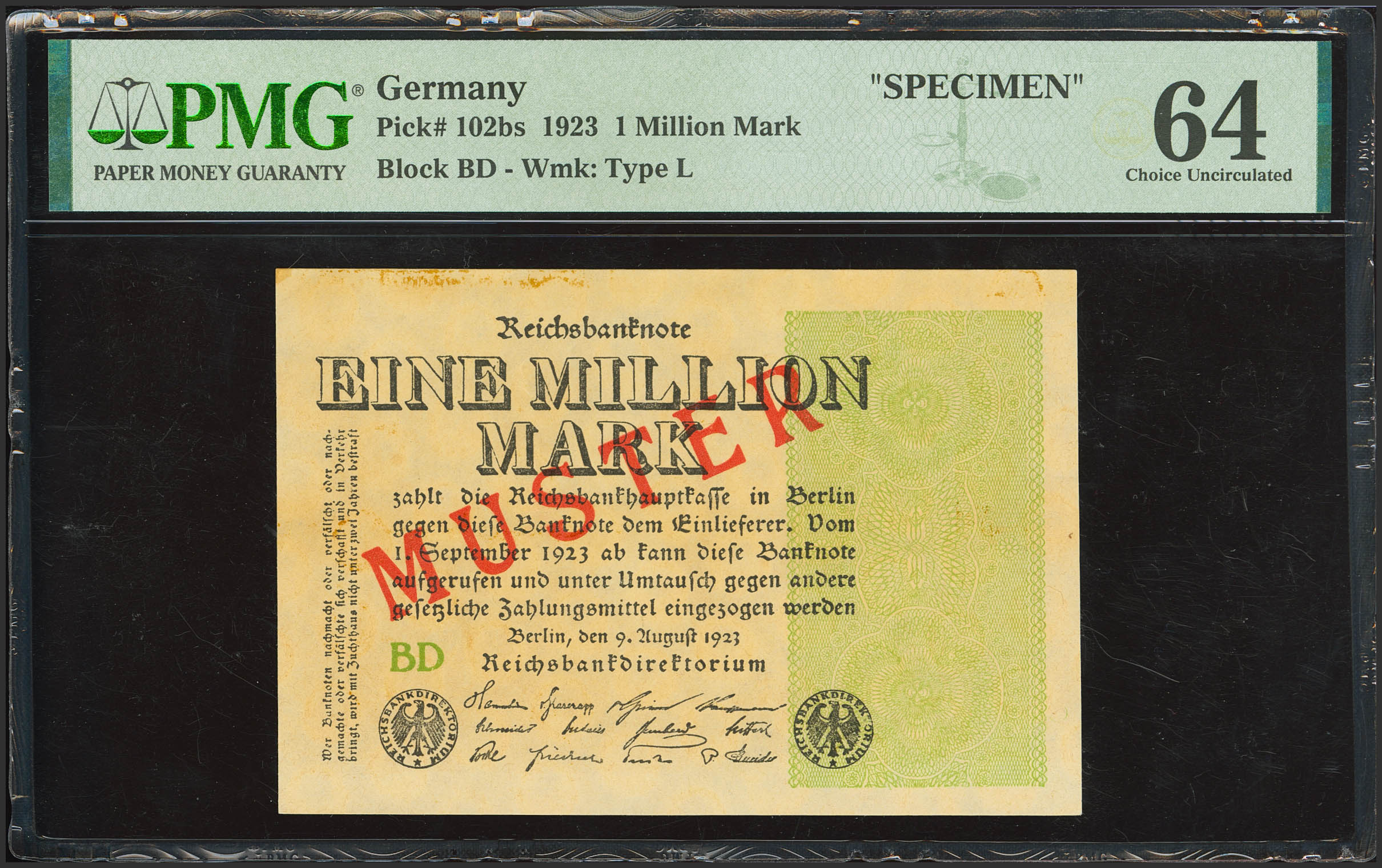 GERMANY. 1000000 Mark. 1923. Specimen. (Pick: 102bs). Rare. PMG64 (previously mounted).