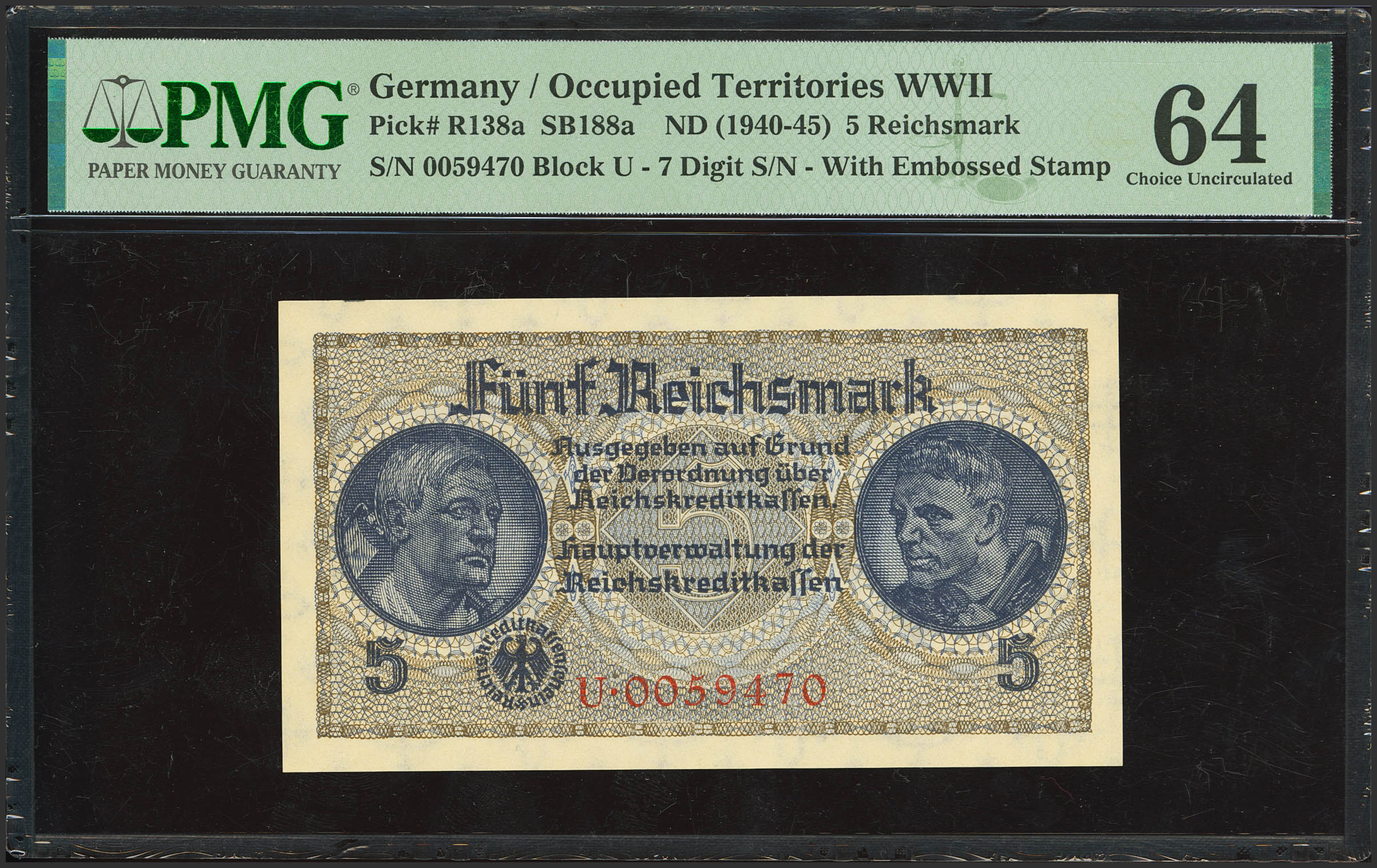 GERMANY. 5 Mark. Occupied territories WWII. (1940ca). (Pick: R138a). PMG64.