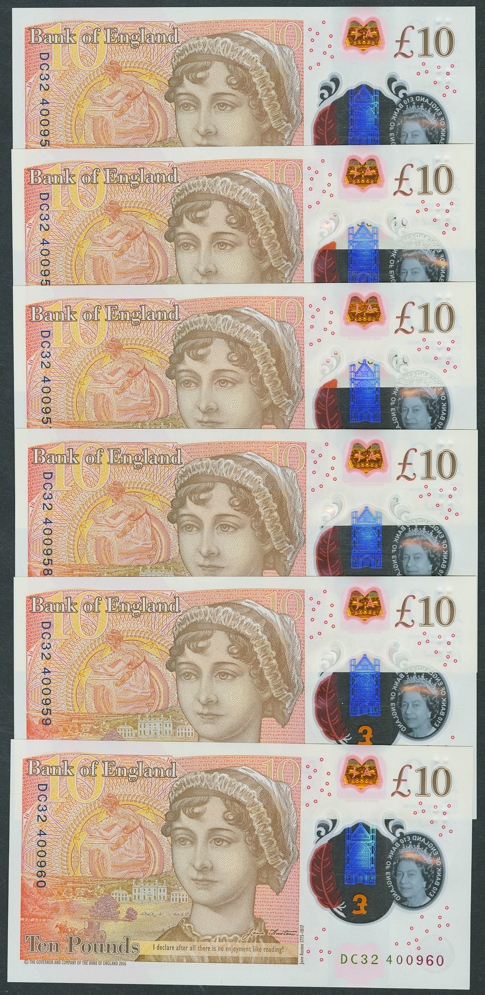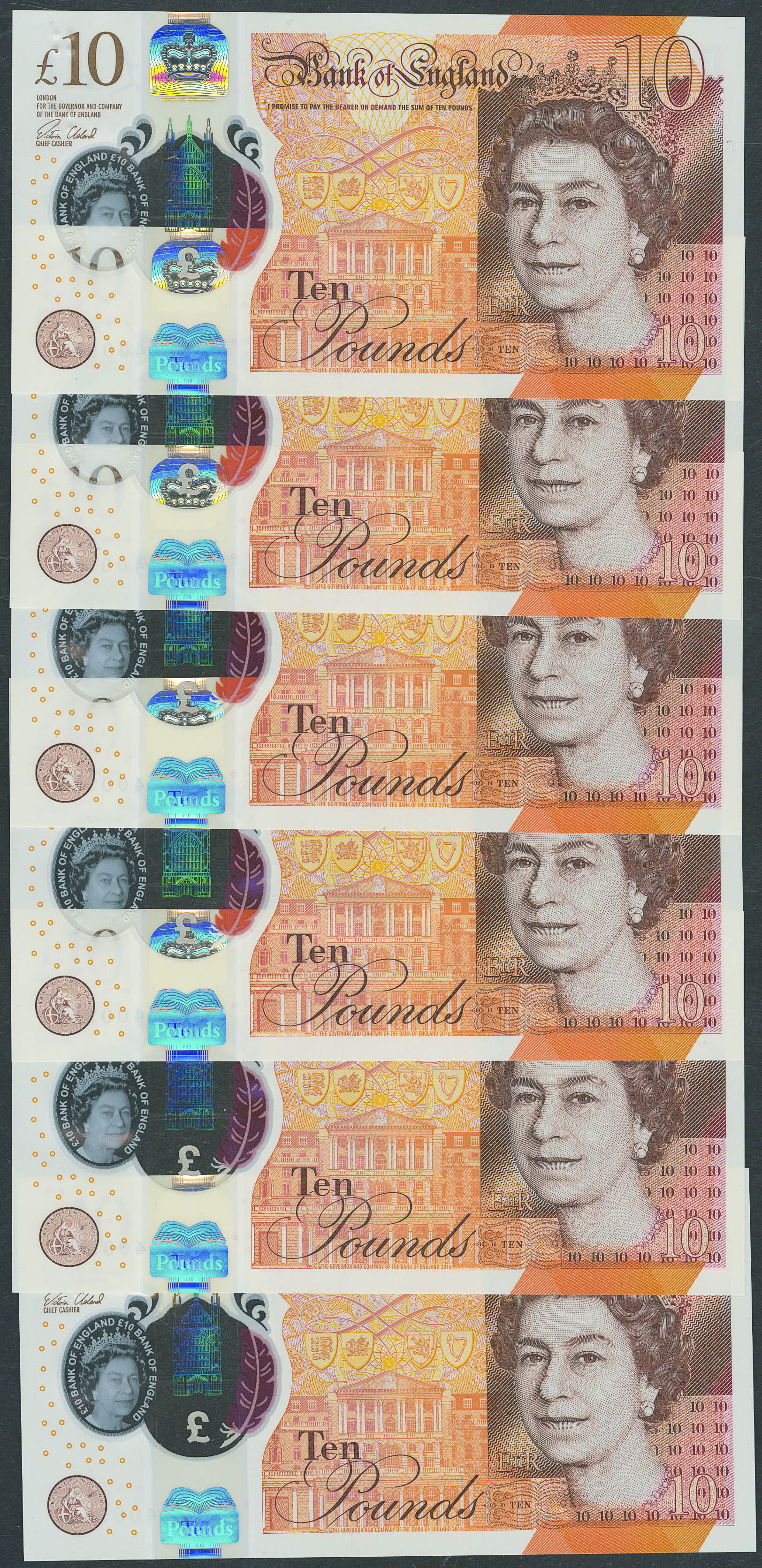 Set of 6 banknotes correlative of Great Britain of 10 Pounds. (2016ca). (Pick: 395). Uncirculated.