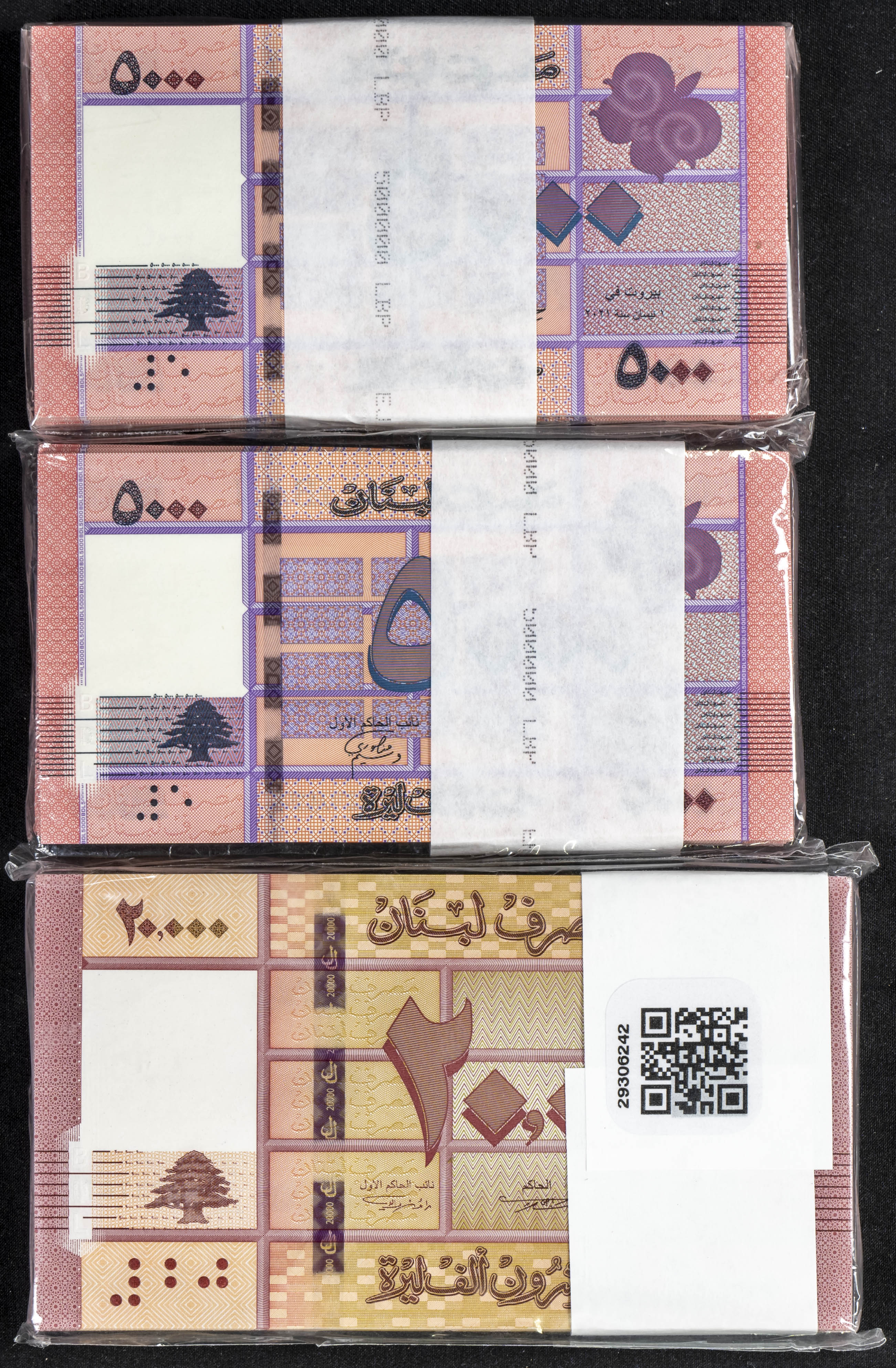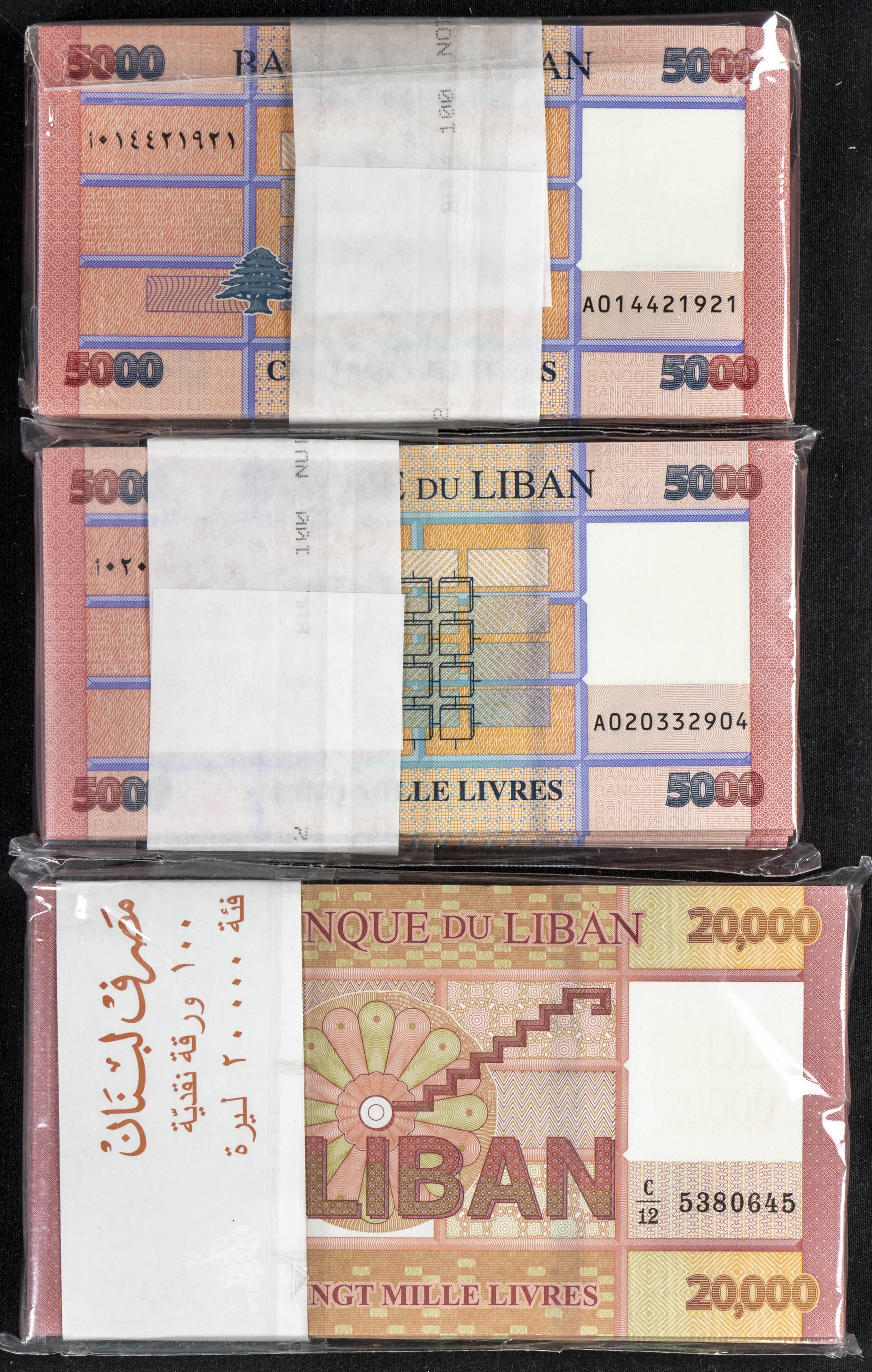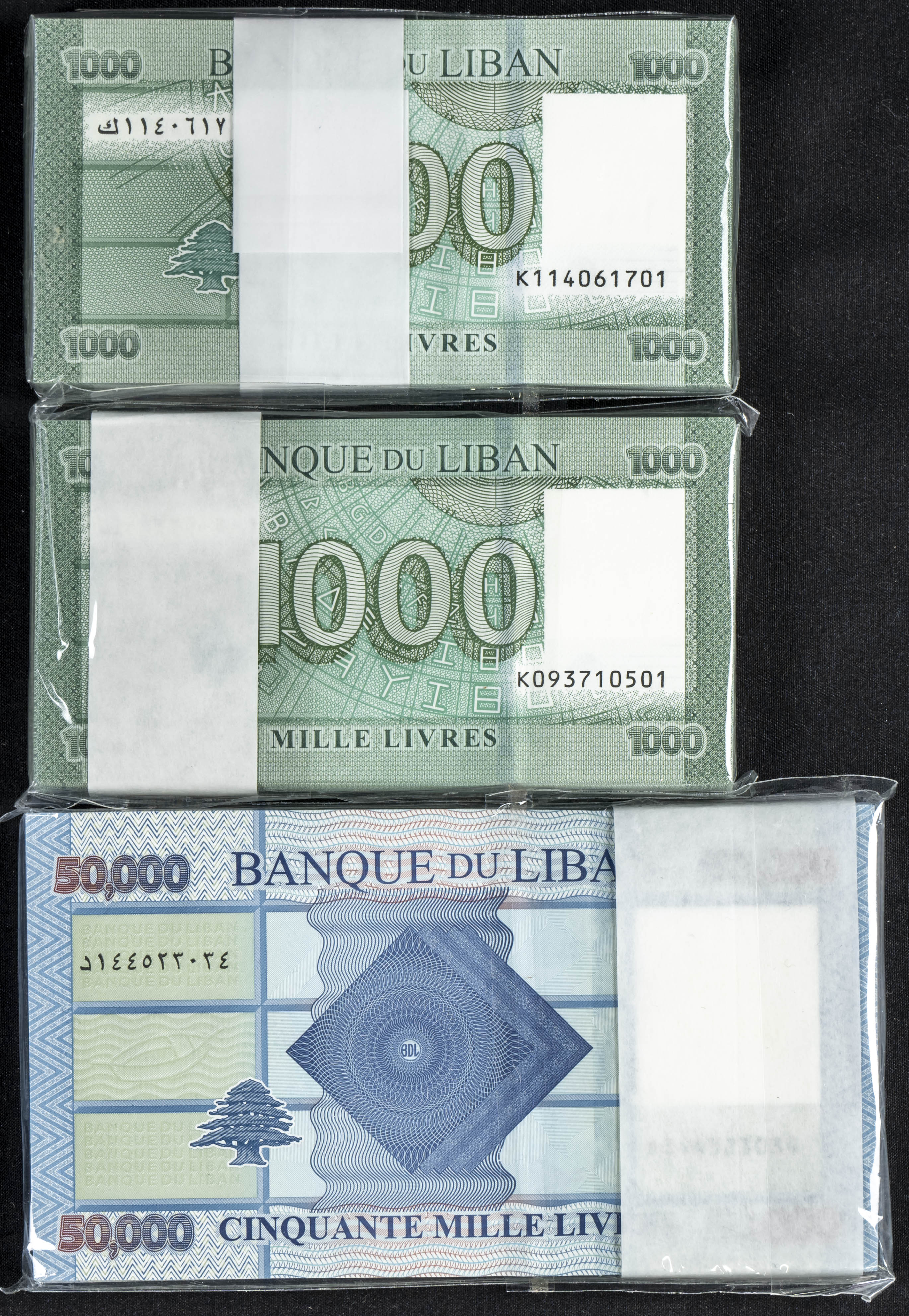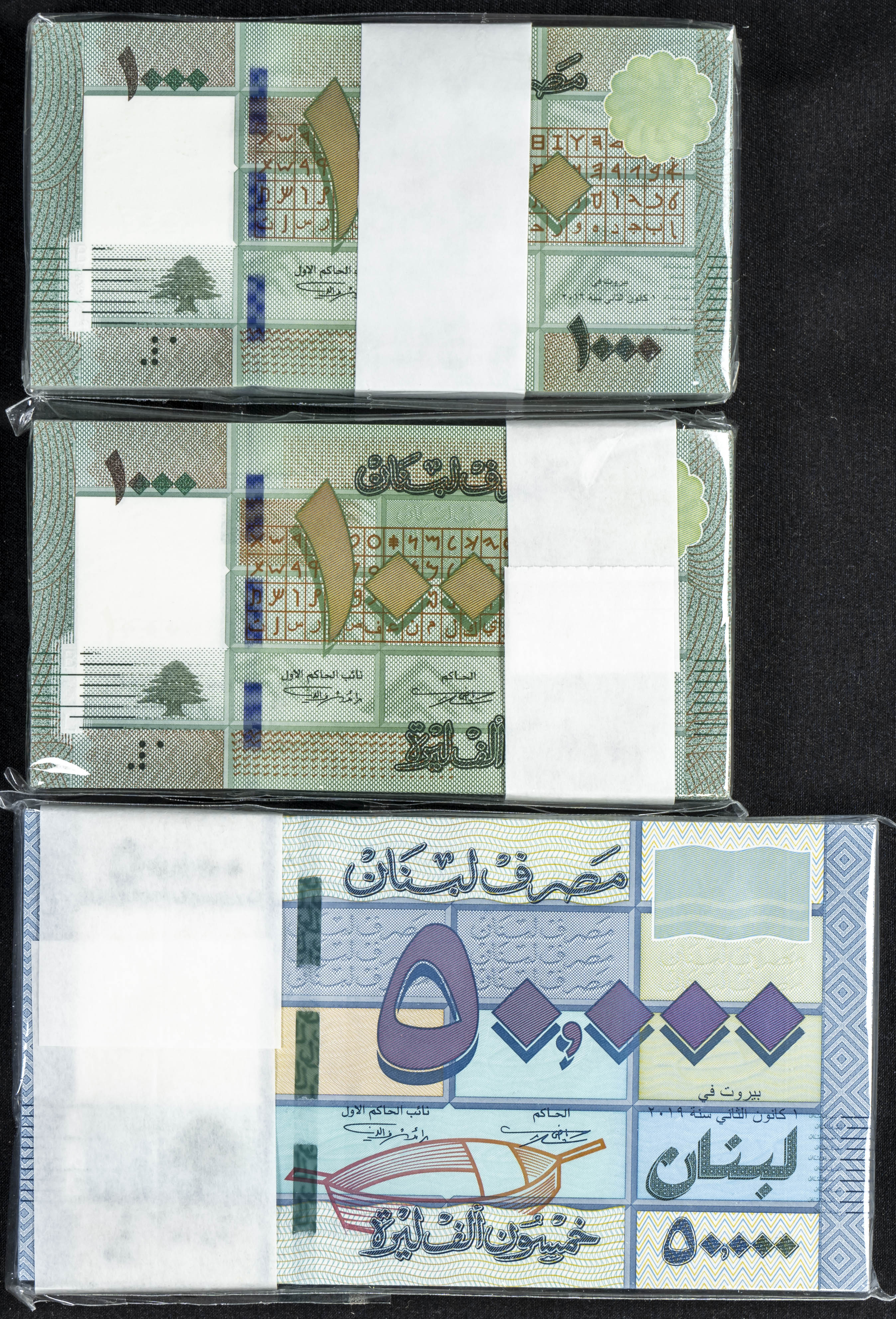 Set of 6 bundles of 100 banknotes from Lebanon of various denominations, most of them very nice qualities. TO EXAM.