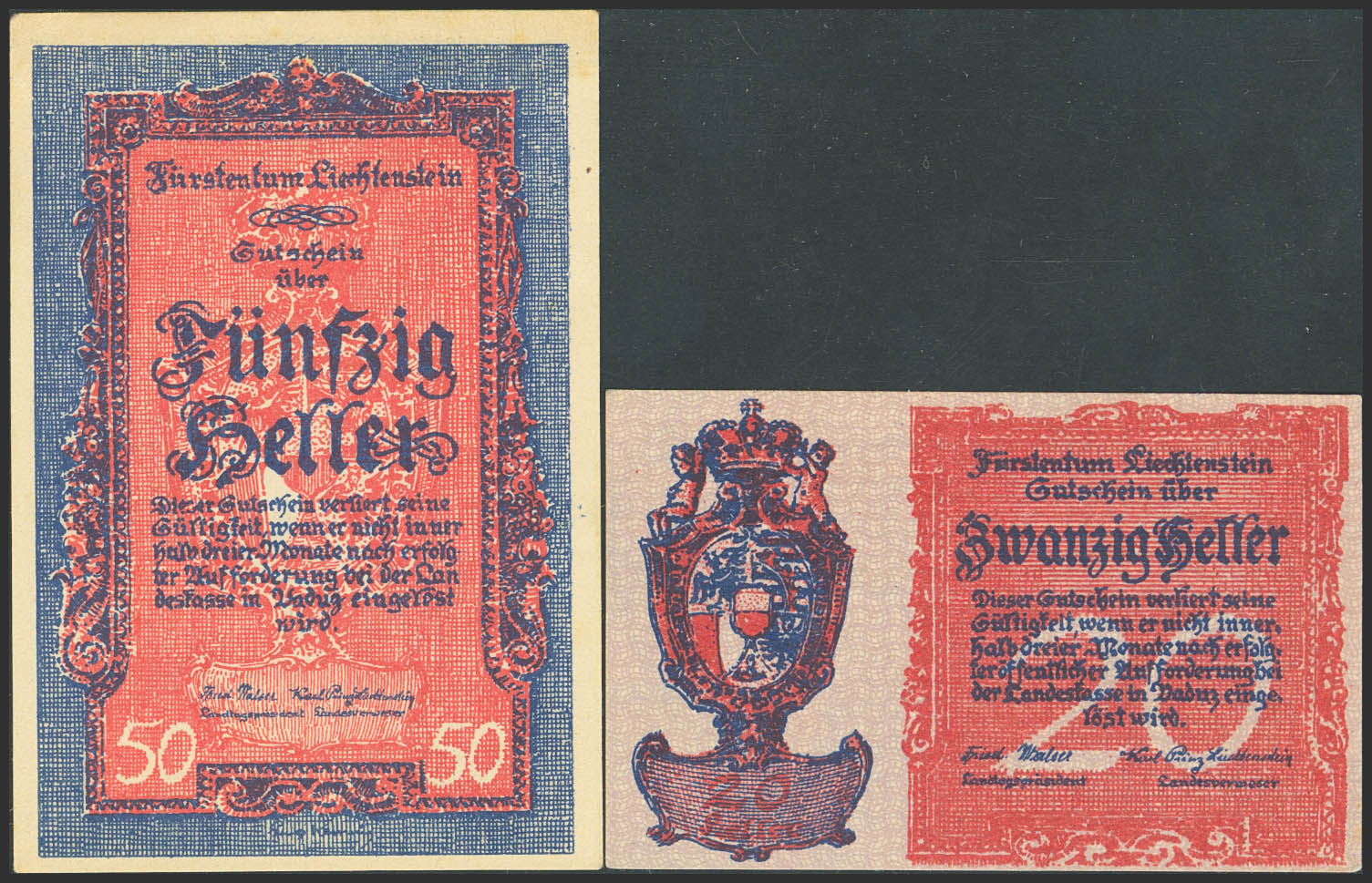 LIECHTENSTEIN-NOTGELD. 20 Heller and 50 Heller. 1920. (Pick: 2, 3). Less than Uncirculated.