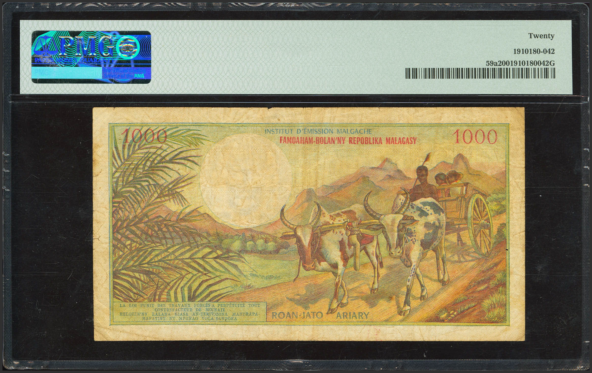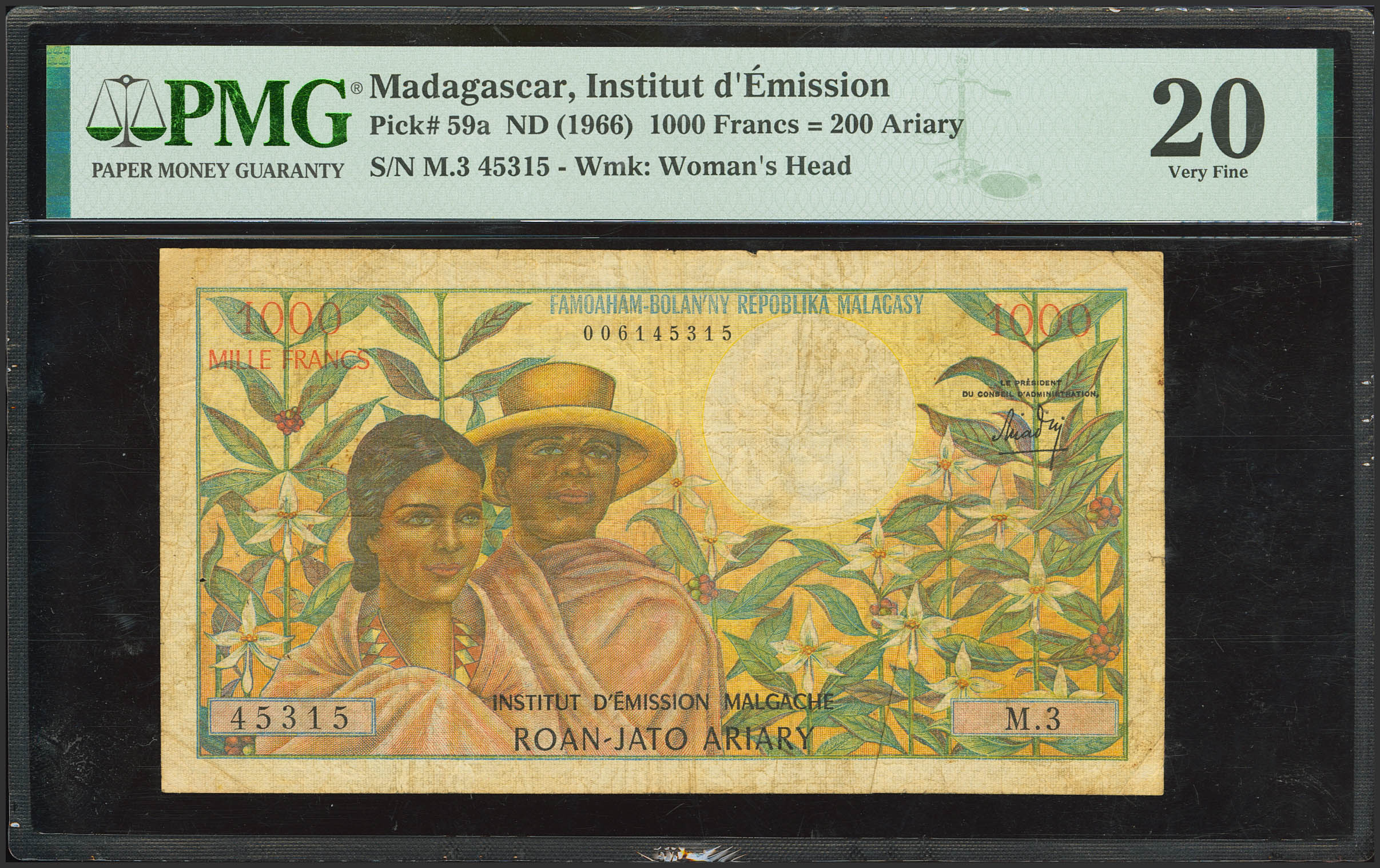 MADAGAUncirculatedAR. 1000 Francs. 1966. (Pick: 59a). PMG20.