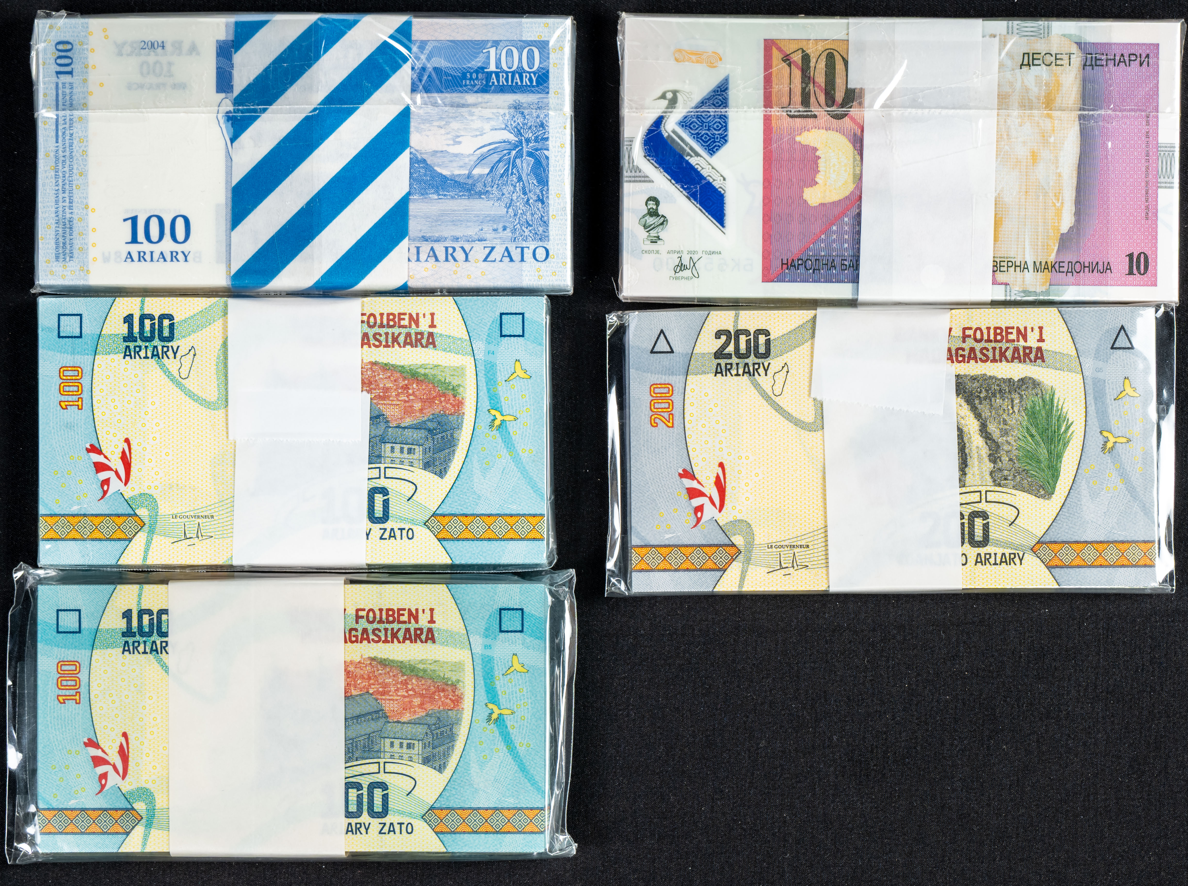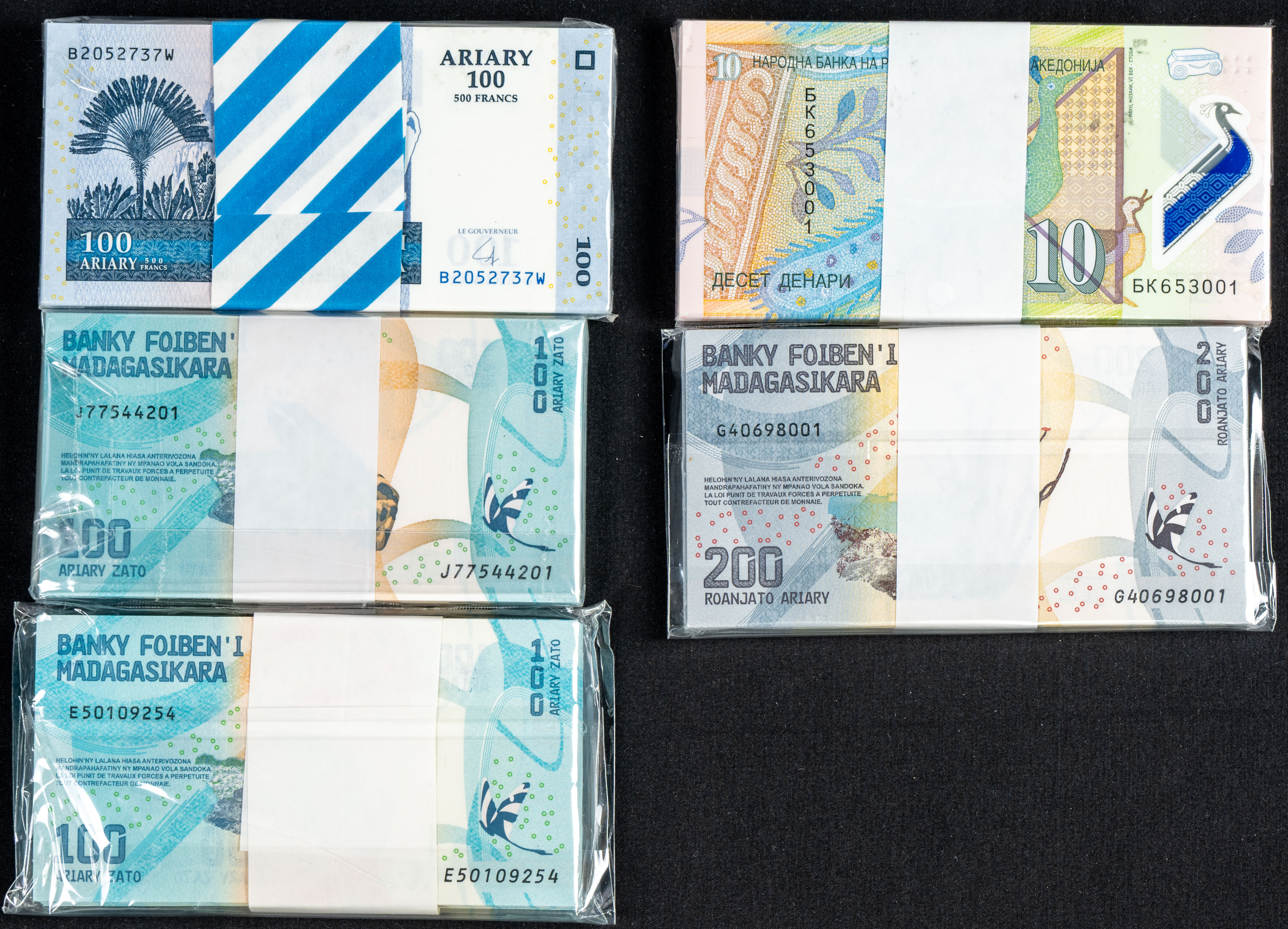 English Set of 5 bundles of 100 banknotes from Madagascar of various denominations, most of them very nice qualities. TO EXAM.