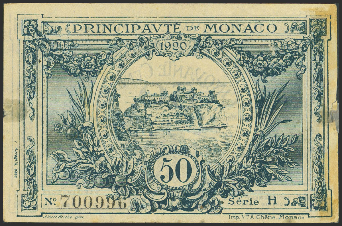MONACO. 50 Centimes. March 20, 1920. (Pick: 3). Pinhole and repaired. Fine.