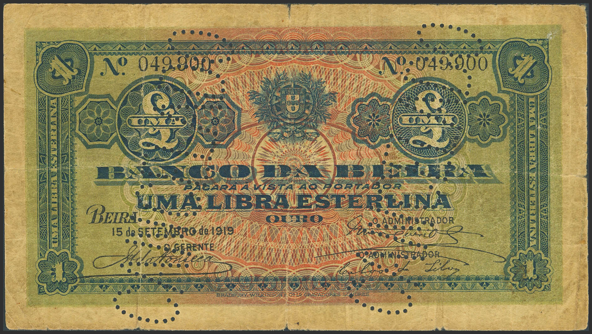 MOZAMBIQUE. 1 Pound. 15 September 1919. (Pick: R6c). Cancelled. Less than Fine.