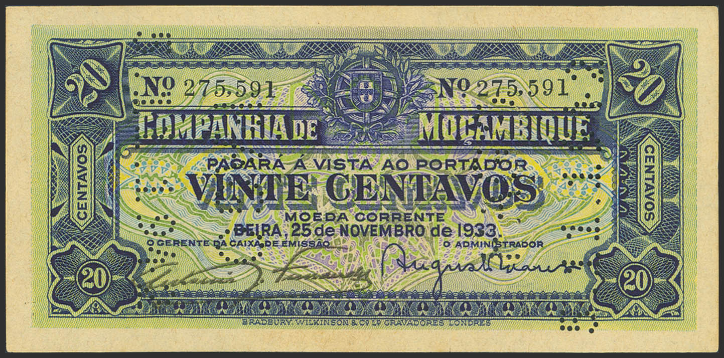 MOZAMBIQUE. 20 Cents. 25 November 1933. (Pick: R28). Stains and cancelled. Less than Uncirculated.