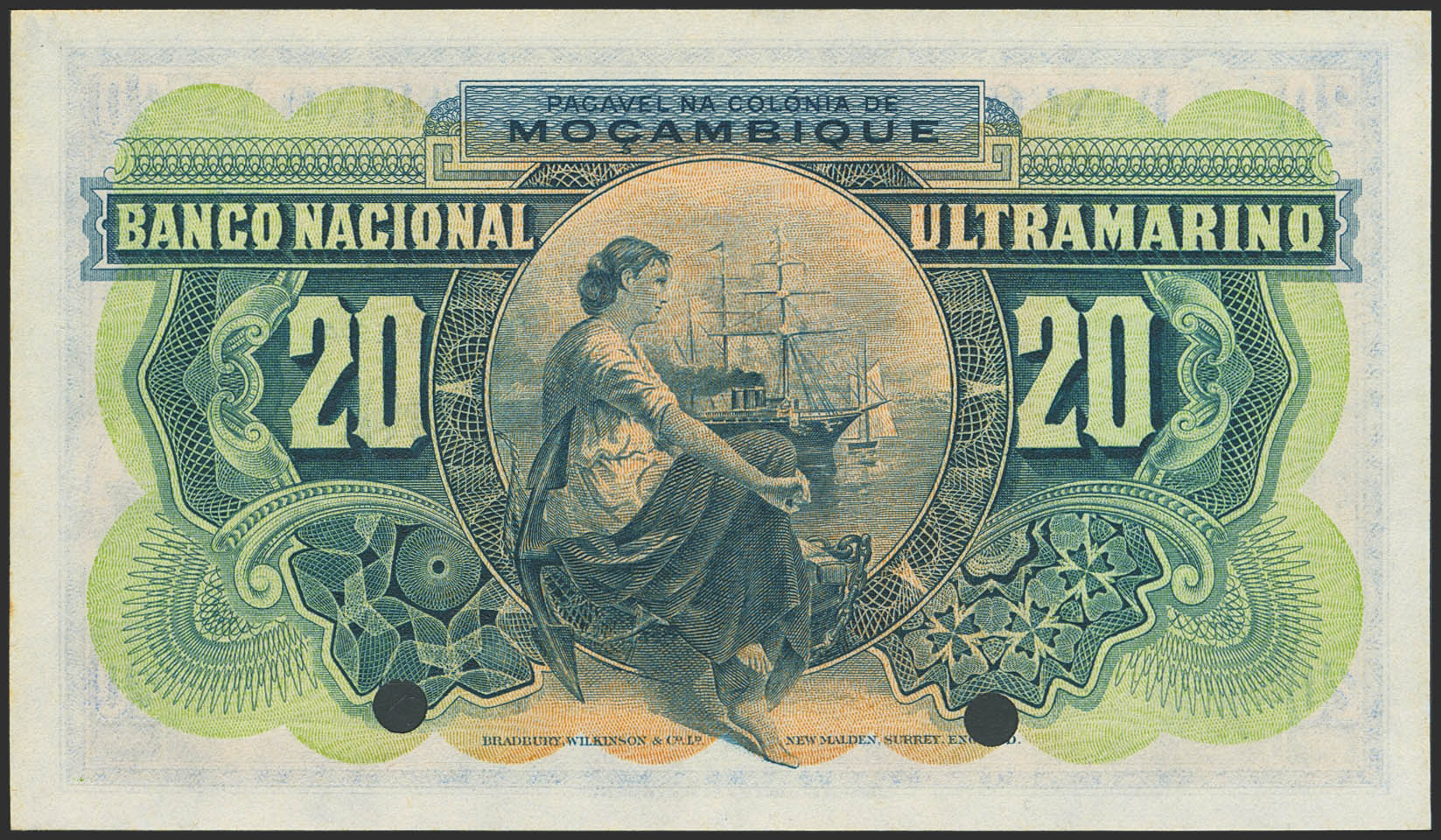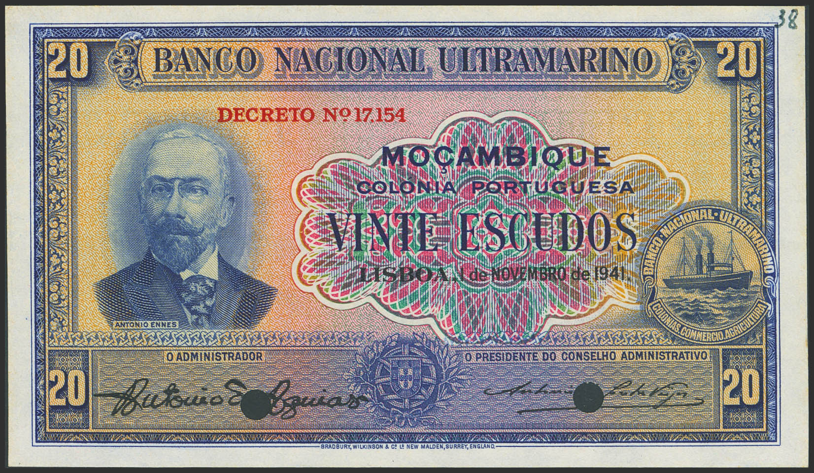 MOZAMBIQUE. 20 Shields. Portuguese administration. 1941. Specimen. (Pick: 85s). About Uncirculated.