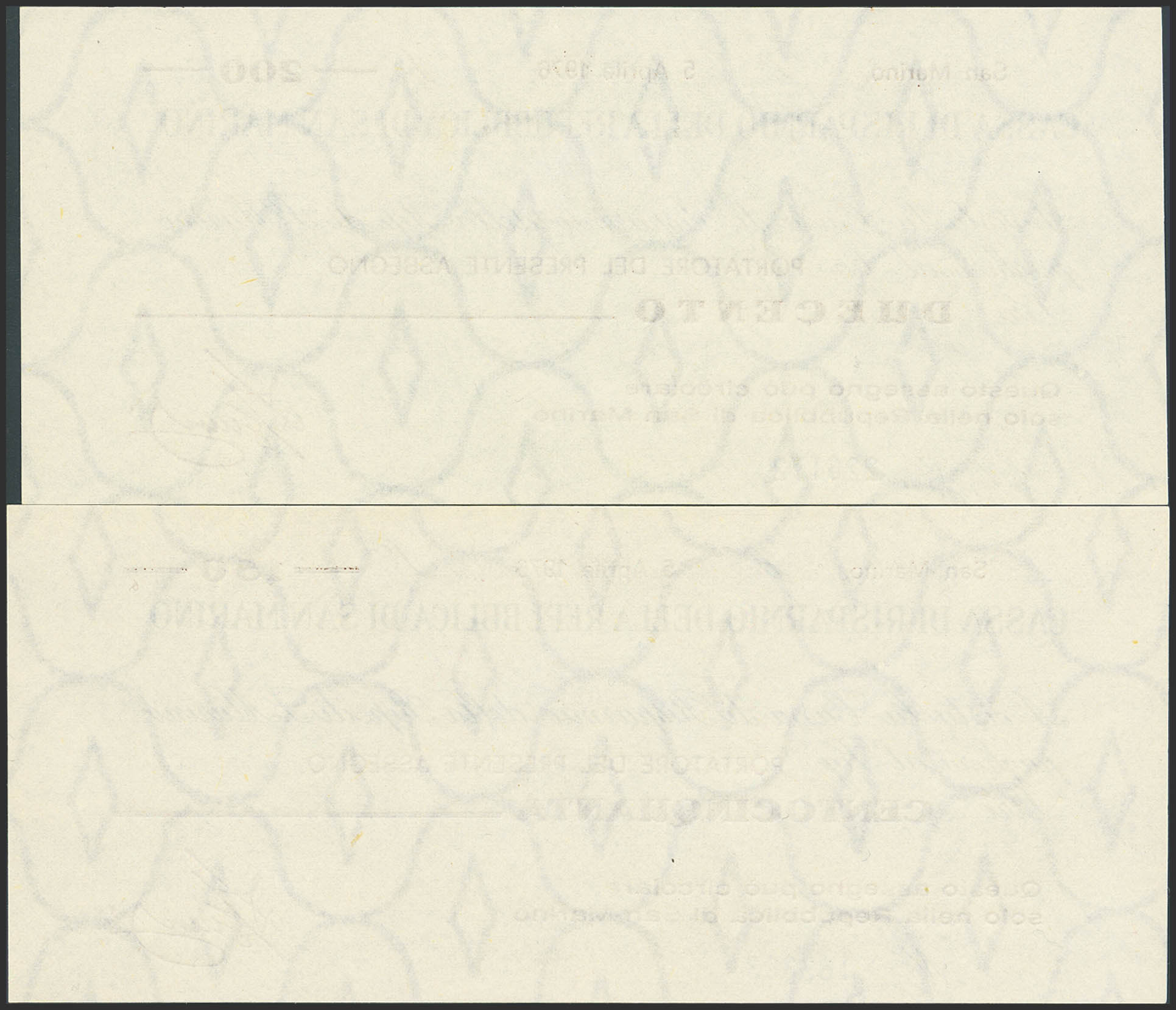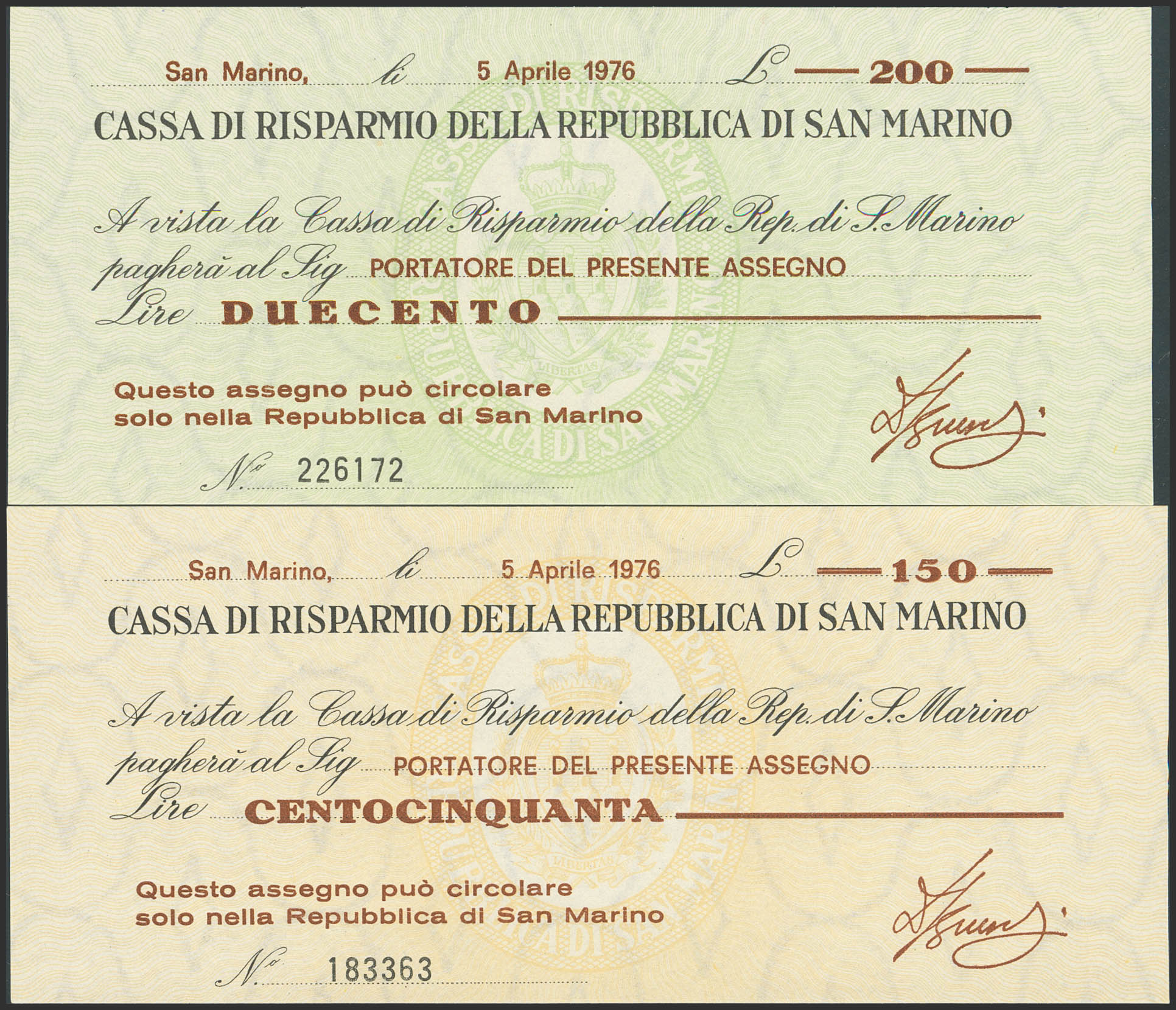 English SAN MARINO. 150 Lires and 200 Lires. April 5, 1976. (Pick: S101, S102). Unusual. Uncirculated / Less than Uncirculated.