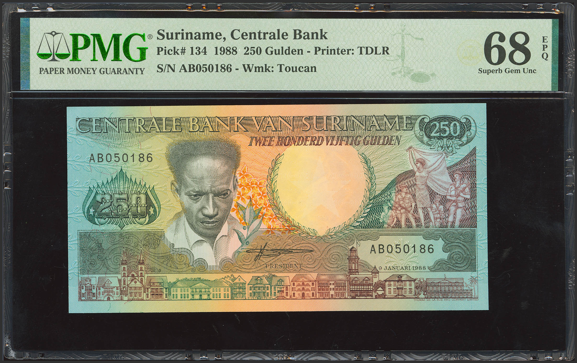 SURINAME. 250 Gulden. 1988. (Pick: 134). PMG68EPQ.