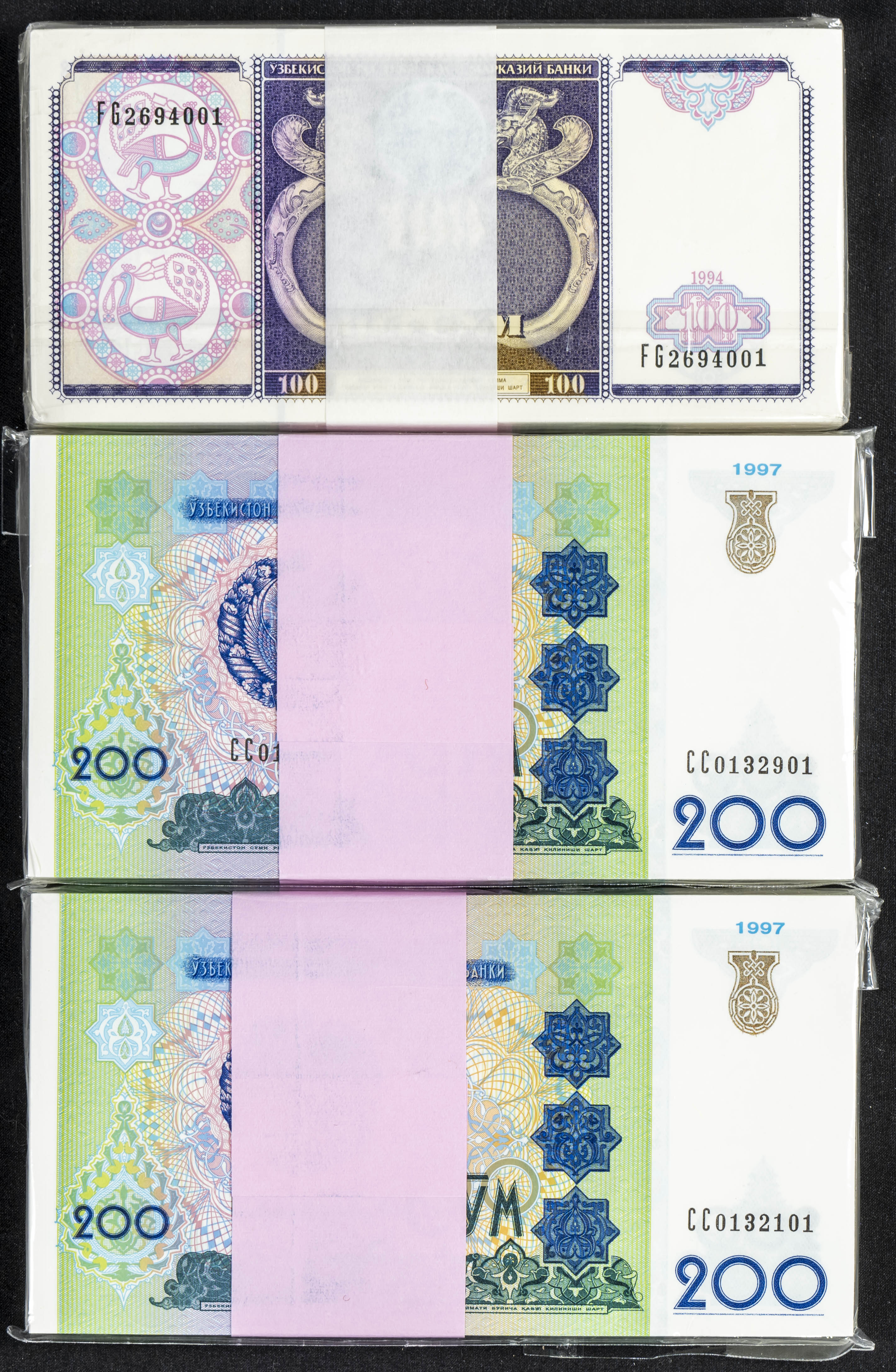 Set of 3 bundles of 100 banknotes from Uzbekistan of various denominations, most of them very nice qualities. TO EXAM.