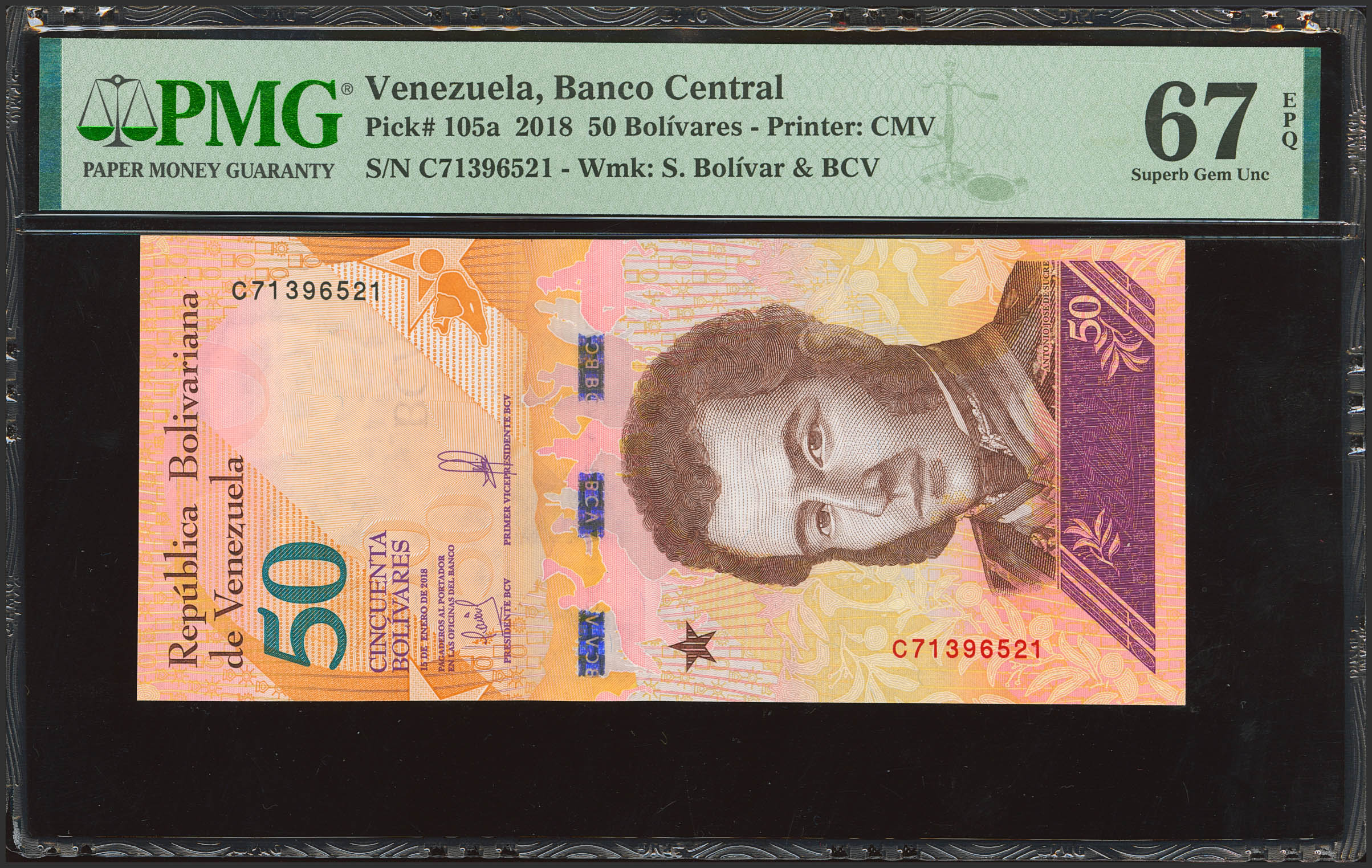VENEZUELA. 50 Bolivars. 2018. (Pick: 105a). PMG67EPQ.