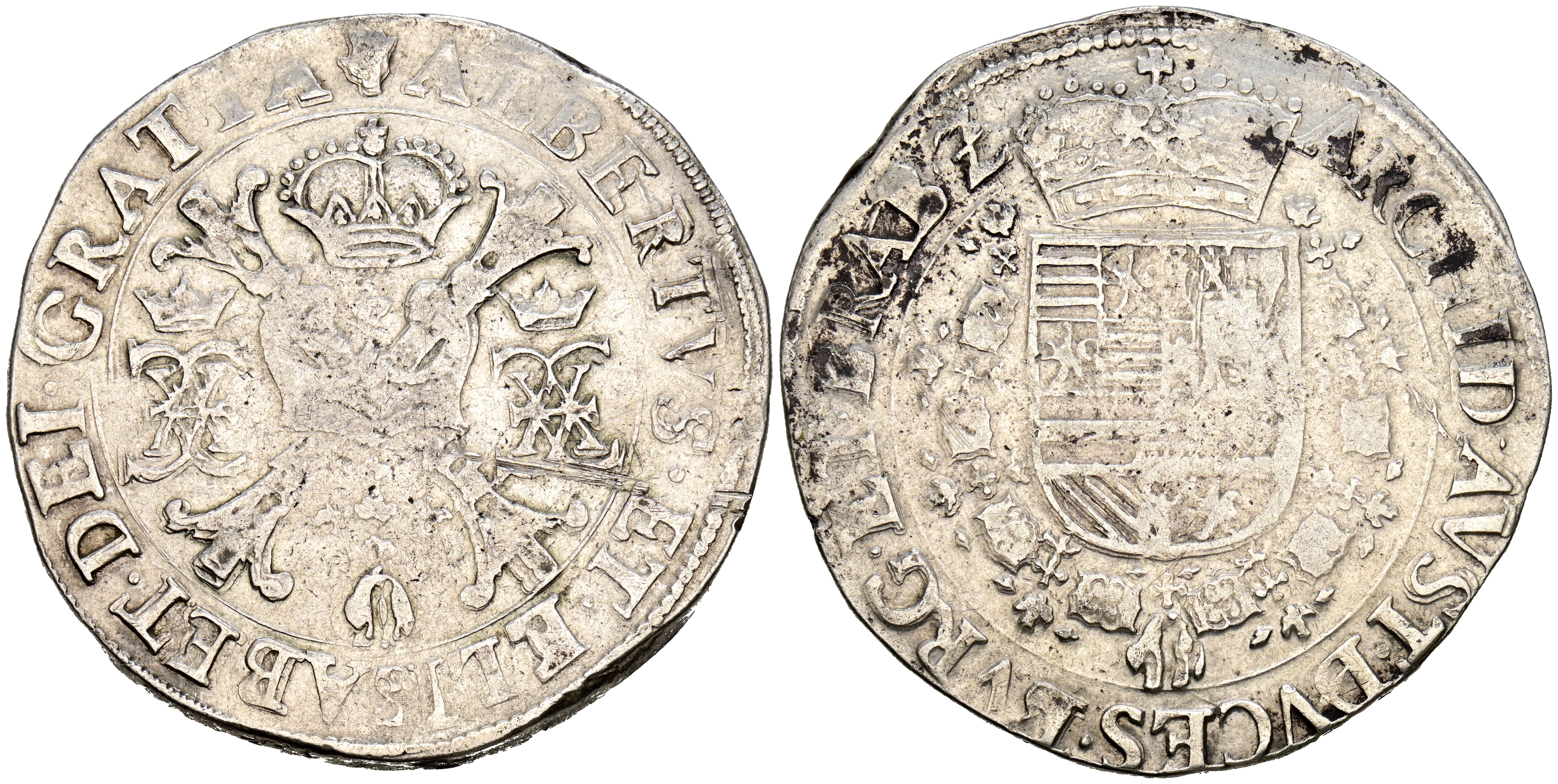 ALBERT AND ISABEL (1598-1621). 1 Patagon. (Ar. 27.72g/42mm). S/D. Antwerp. (Vicenti 346). Very Fine-.