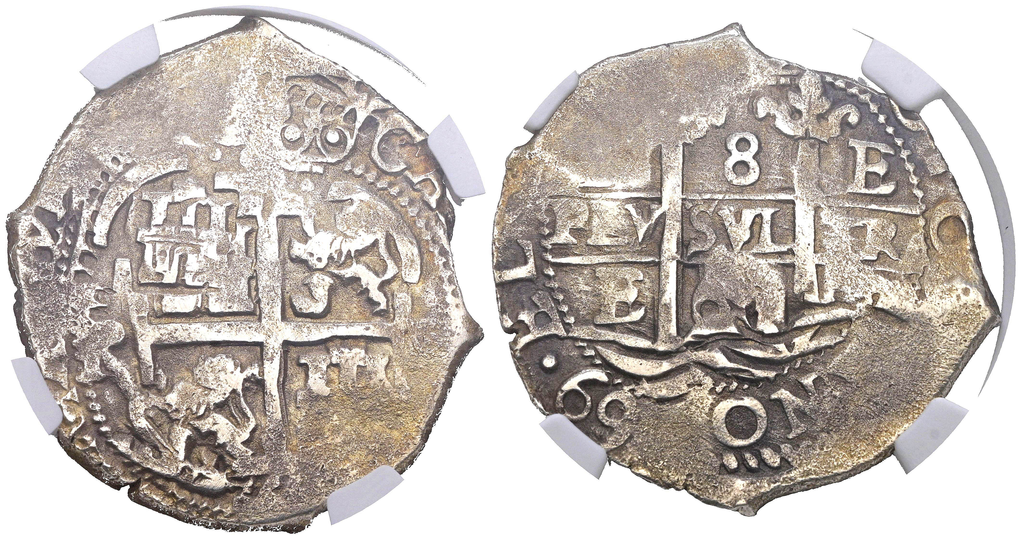 CHARLES II (1665-1700). 8 Reales. (Ar. 25.00g/37mm). 1669. Potosí E. (Cal-2019-700). Partially triple-dated on the obverse. Encapsulated by NGC XF Details, Cleaned. An interesting example.