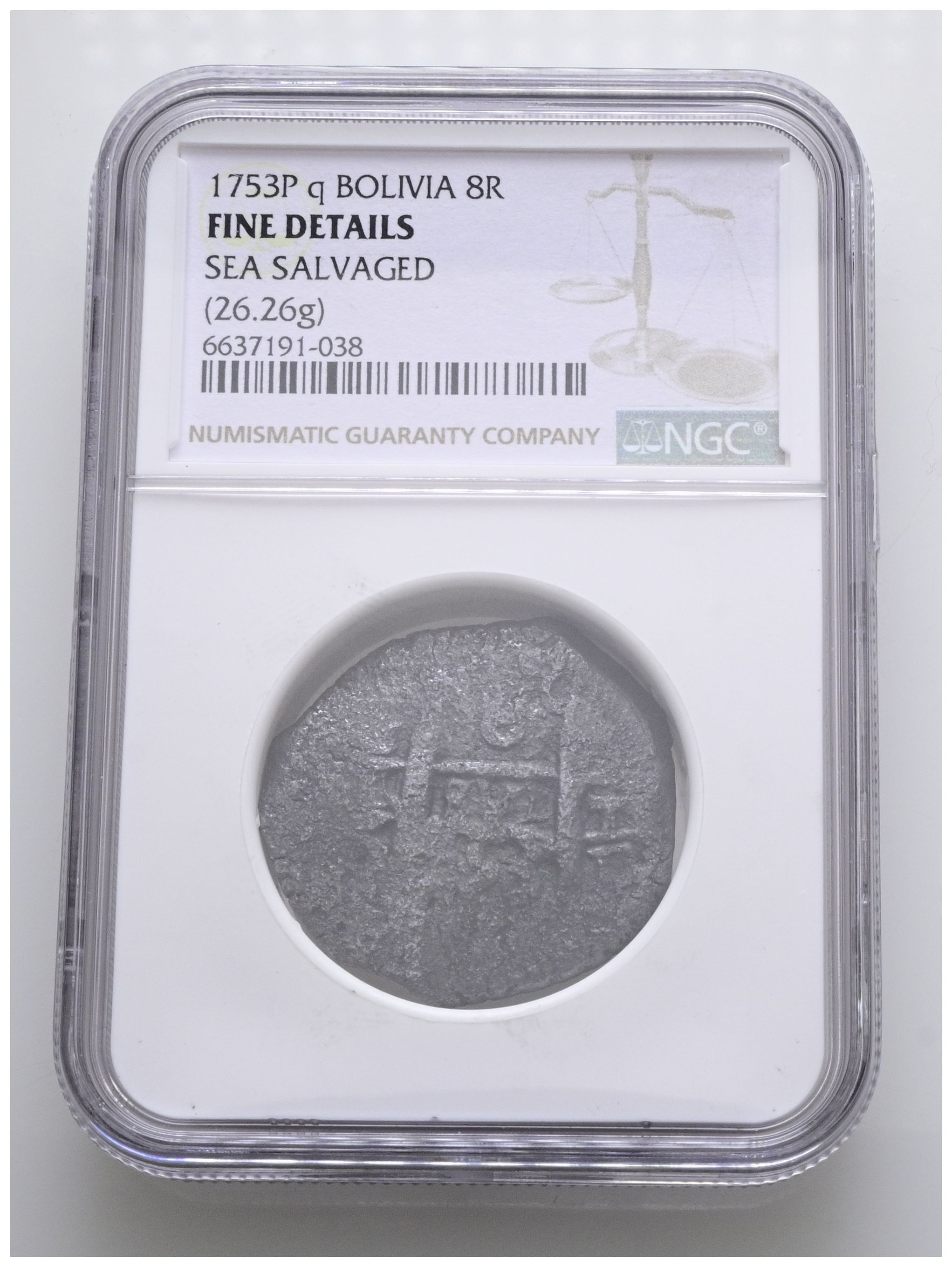 FERDINAND VI (1746-1759). 8 Reales. (Ar. 26.26g/29mm). 1753. Potosí q. (Cal. 2019-524). Encapsulated by NGC Fine Details, Sea Salvaged.
