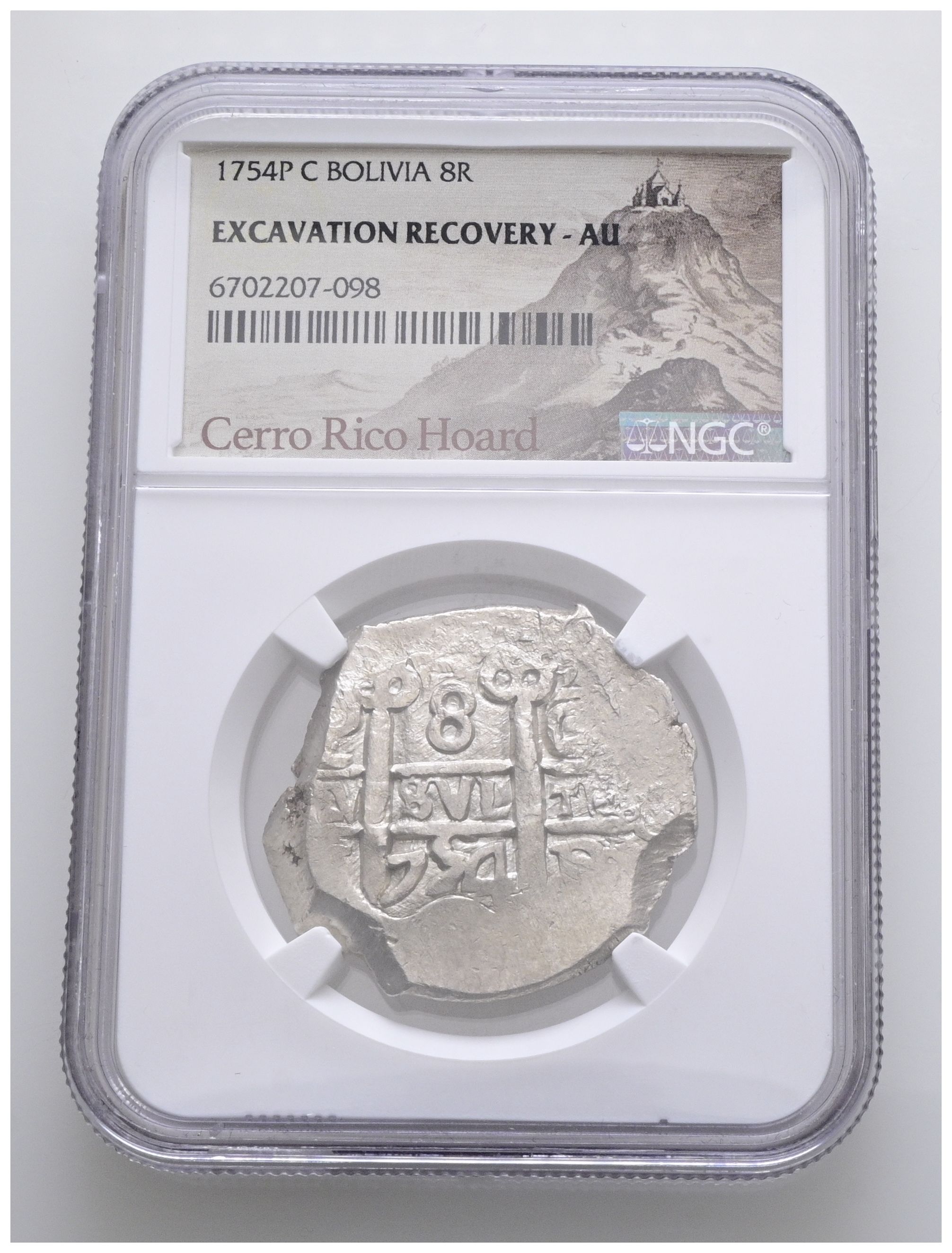 English FERDINAND VI (1746-1759). 8 Reales. (Ar. 27.00g/34mm)*. 1754. Potosí C. (Cal-2019-527). Double date. Encapsulated by NGC AU-Excavation Recovery, special "Cerro Rico Hoard" label. *Theoretical weight and measurements.
