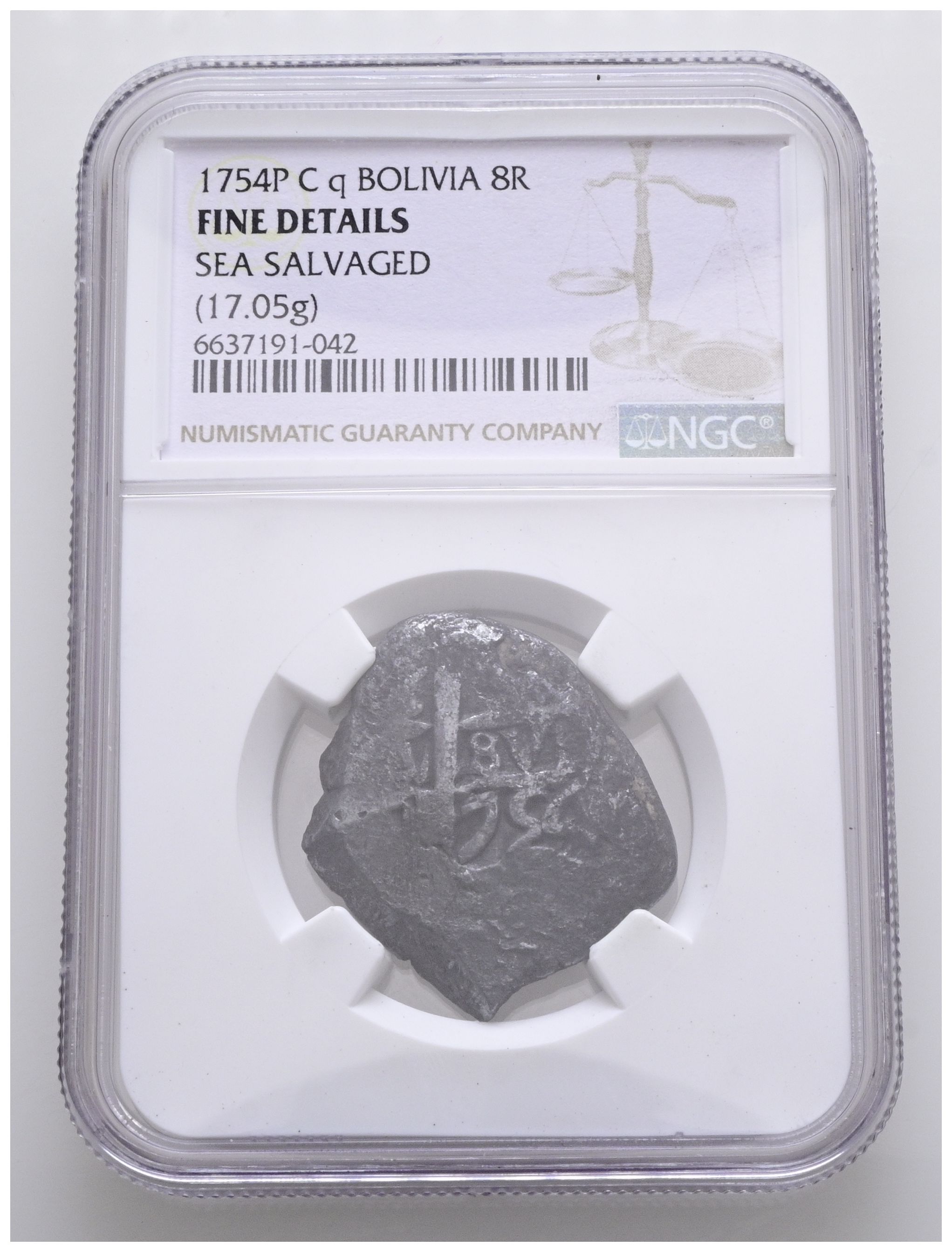 English FERDINAND VI (1746-1759). 8 Reales. (Ar. 17.05g/28mm). 1754. Potosí q. (Cal. 2019-531). Encapsulated by NGC Fine Details, Sea Salvaged.