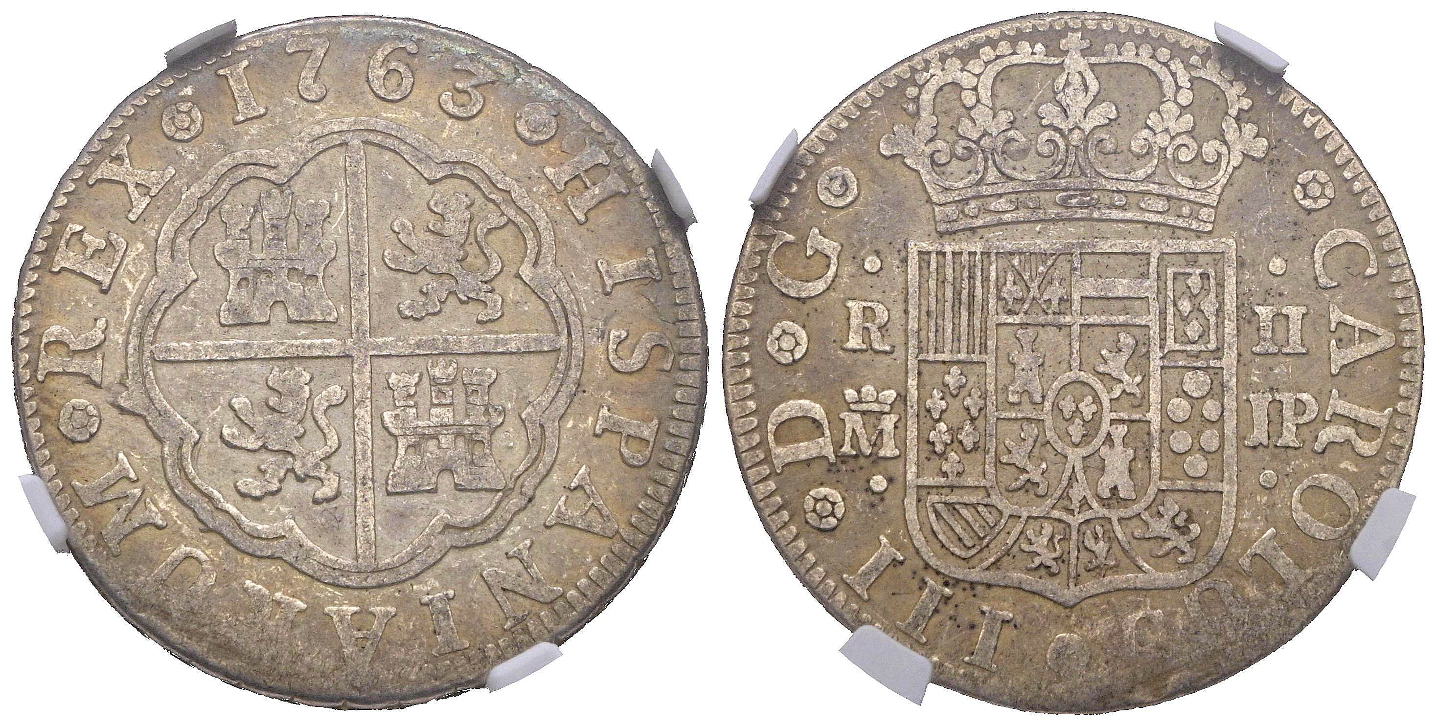 English CHARLES III (1759-1788). 2 Reales. (Ar. 6.00g/26mm)*. 1763. Madrid JP. (Cal-2019-611). Encapsulated by NGC Fine Details, Cleaned. *Theoretical weight and measurements.