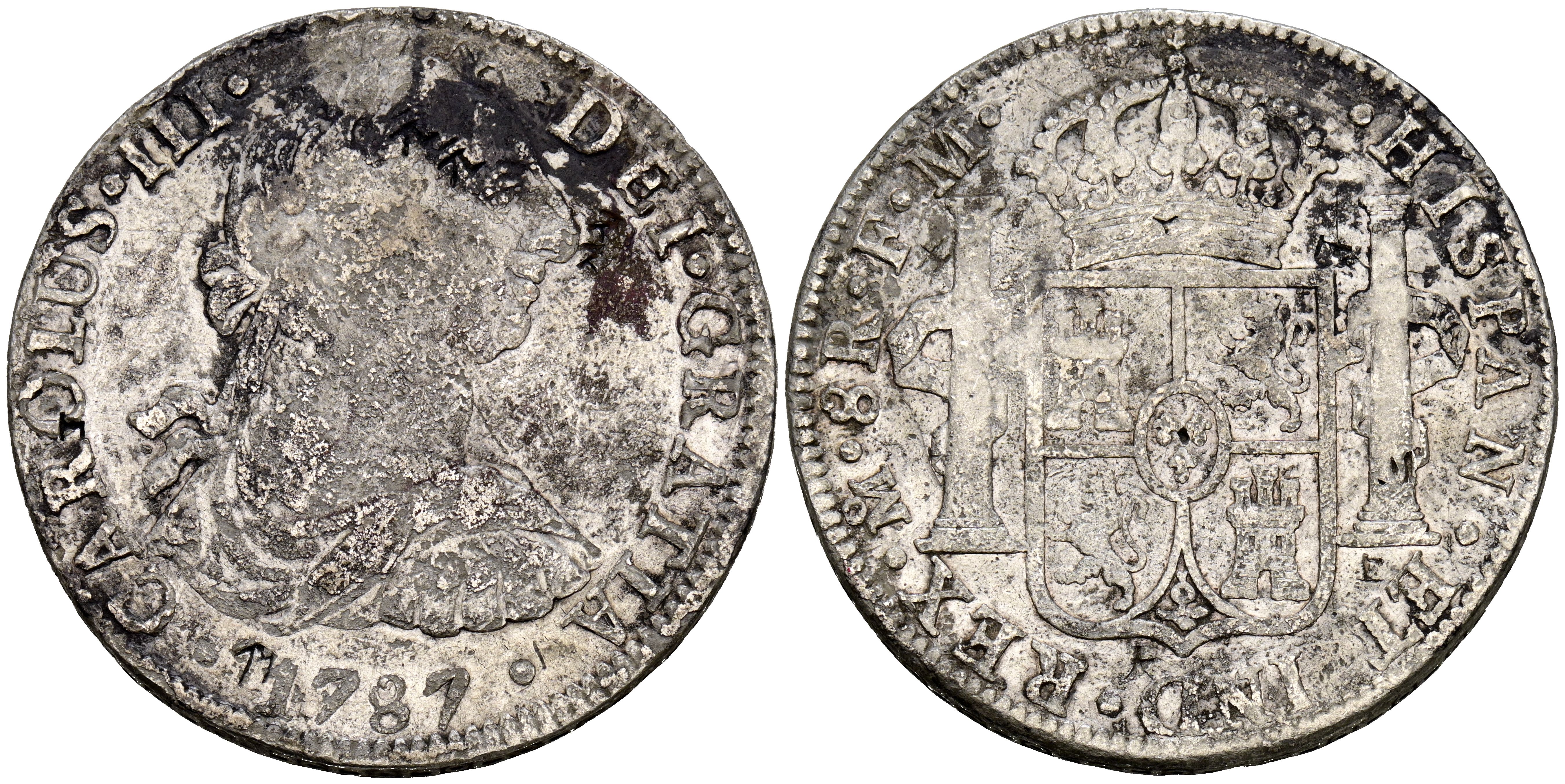 CHARLES III (1759-1788). 8 Reales. (Ar. 26.06g/38mm). 1787. Mexico FM. (Cal-2019-1131). Original coin. Eastern counterstamps.