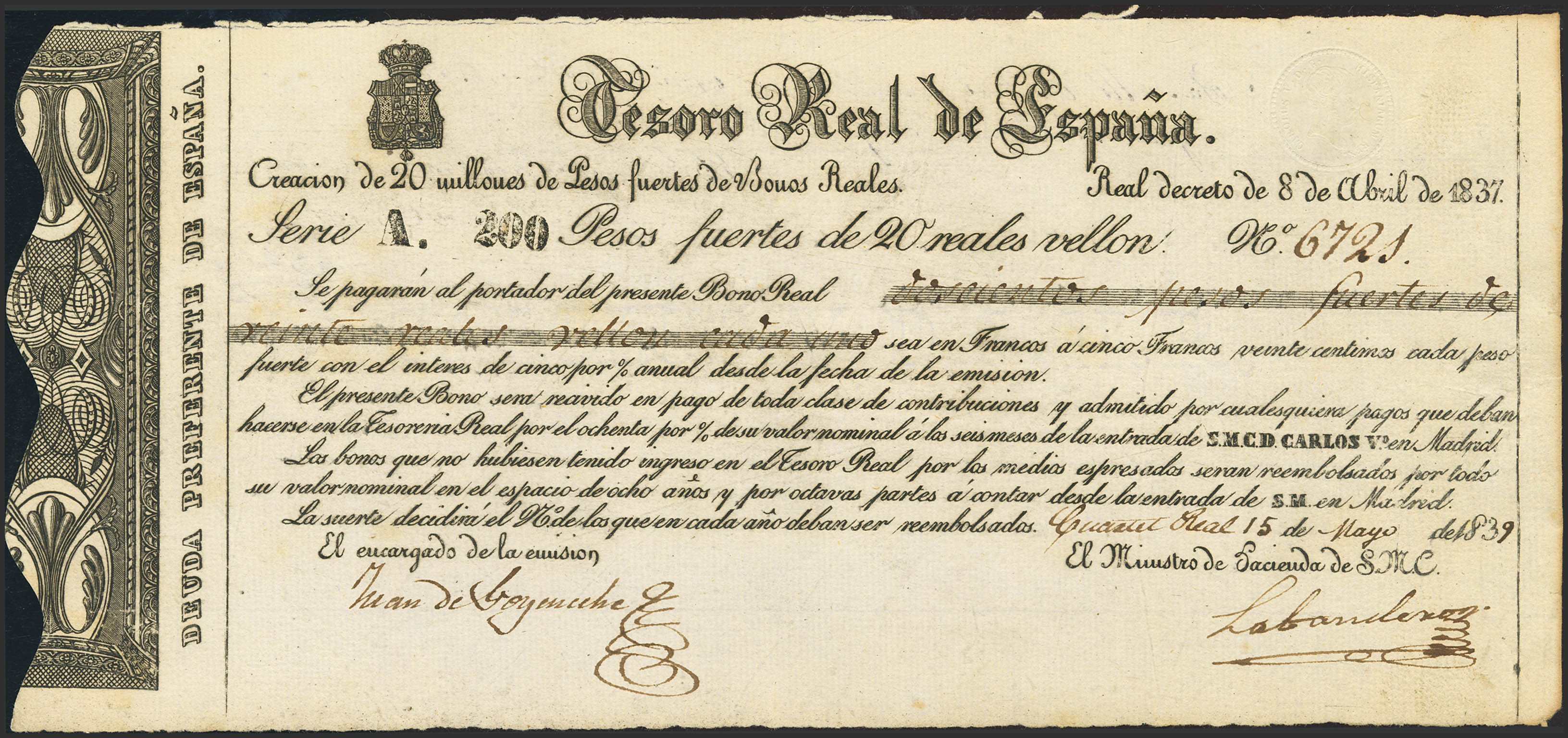 200 Pesos Fuertes of 20 Reales de Vellón. Royal Treasury of Spain. April 8, 1837. Series A. (Edifil 2023: 23). Rare, especially in this exceptional condition. Uncirculated--.