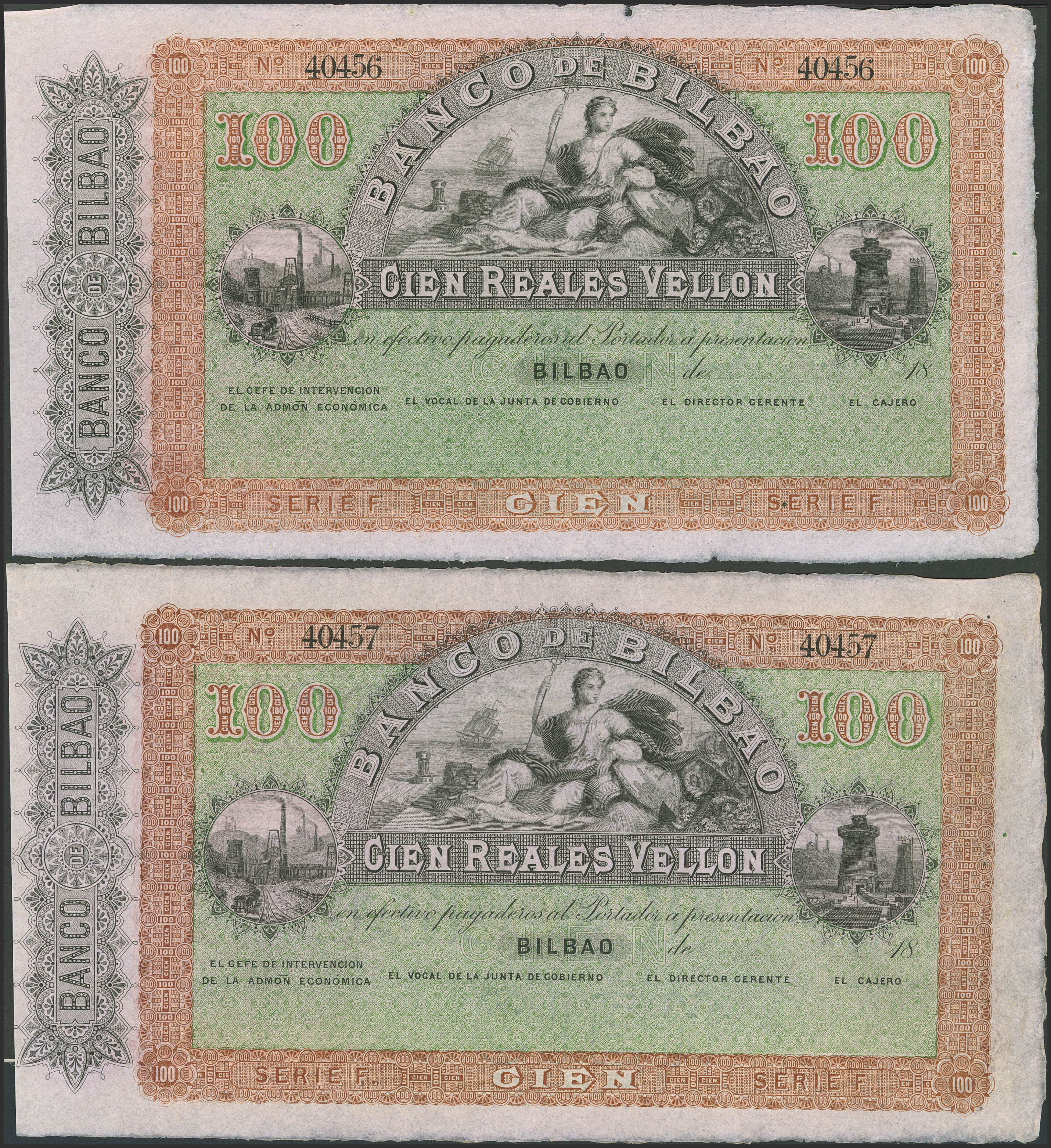100 Reales. August 21, 1857. Consecutive pair. Bank of Bilbao. Series F, unsigned and numbered. (Edifil 2023: 143, Pick: S251r). Uncirculated--.