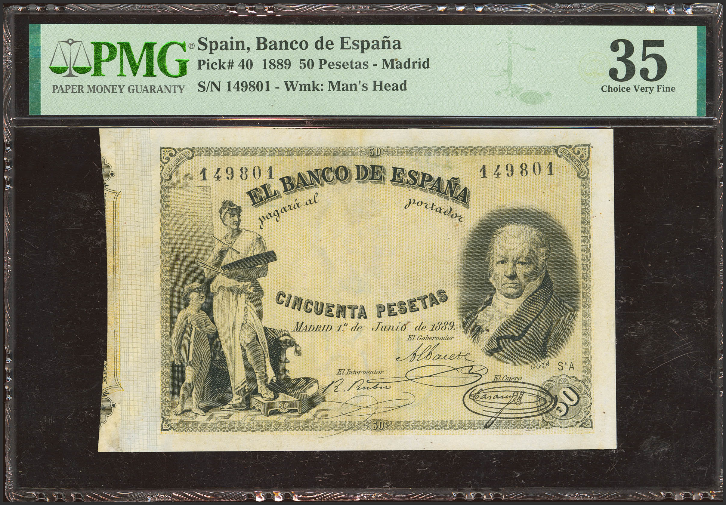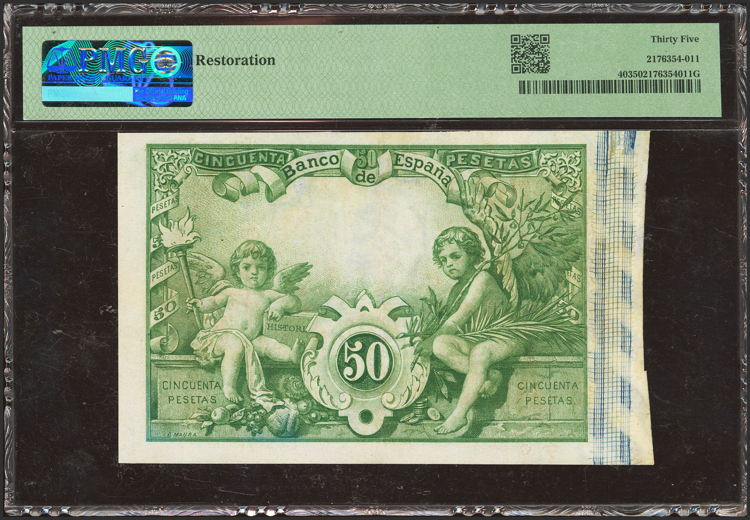 50 Pesetas. June 1, 1889. No serial number. (Edifil 2023: 298, Pick: 40). Very rare, repaired. Good Very Fine. PMG35 (restoration) package.