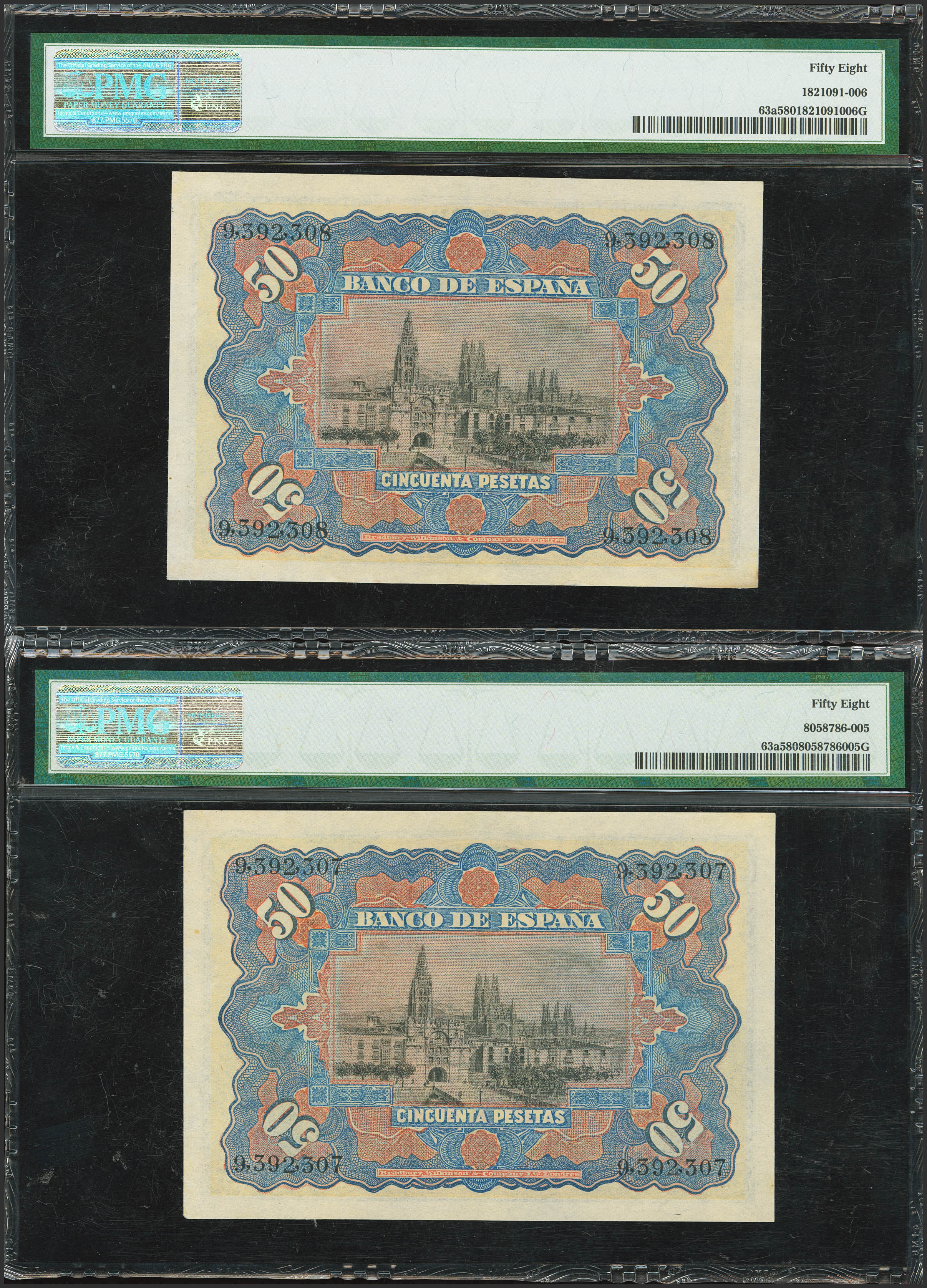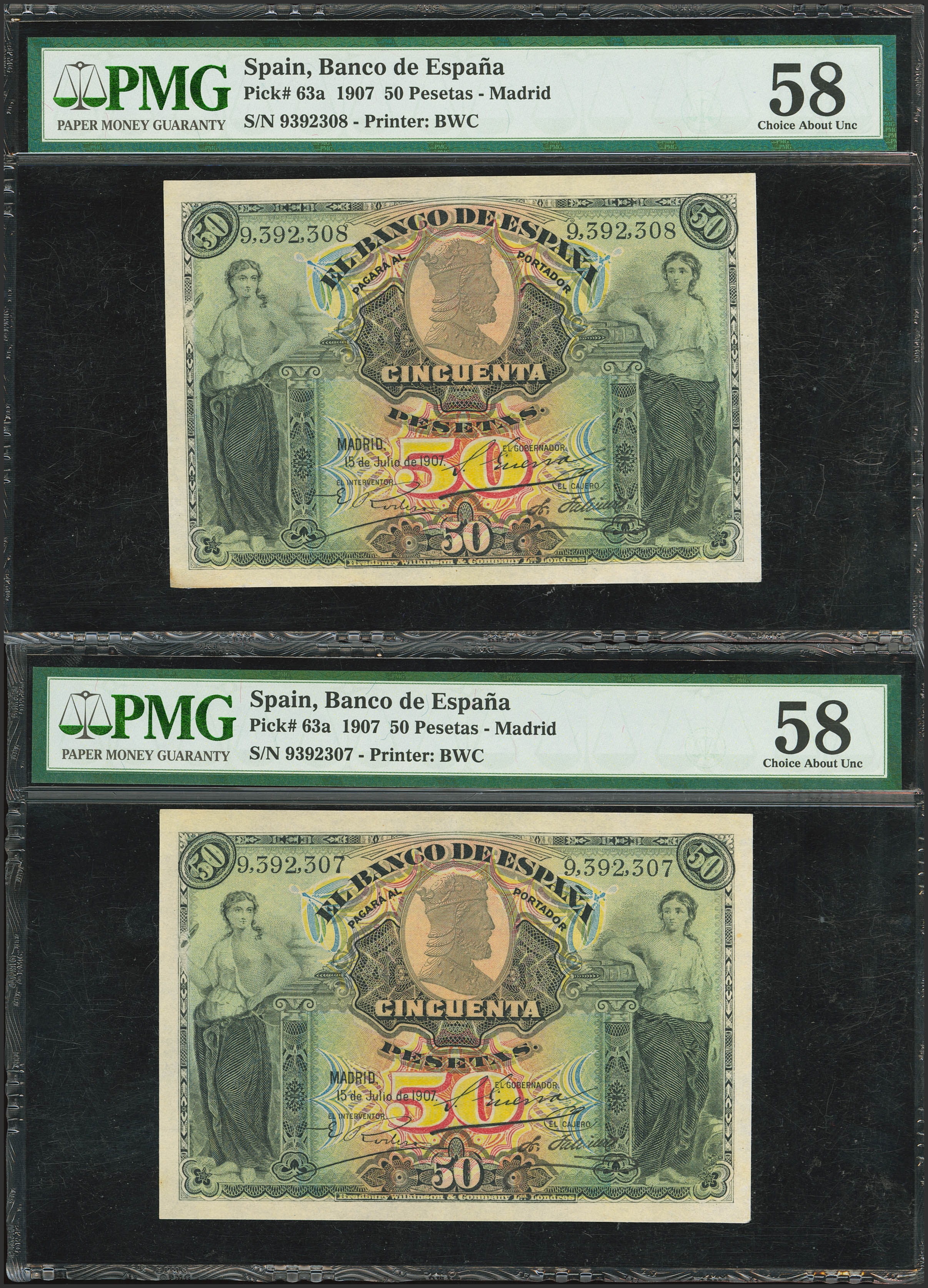 50 Pesetas. July 15, 1907. Consecutive pair. No serial number. (Edifil 2023: 319, Pick: 63a). Very rare pair, especially in this condition. EF++. Both PMG58 capsules.