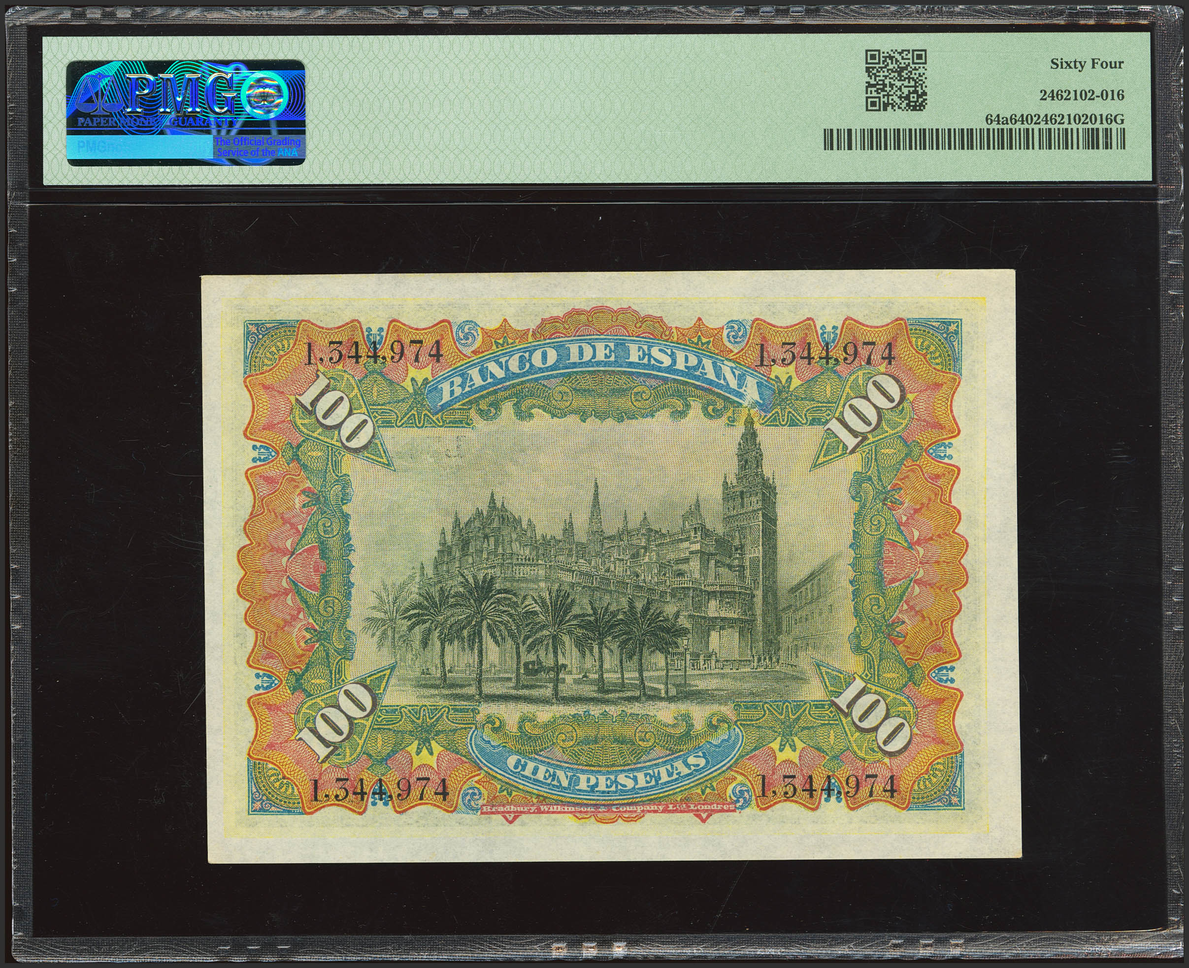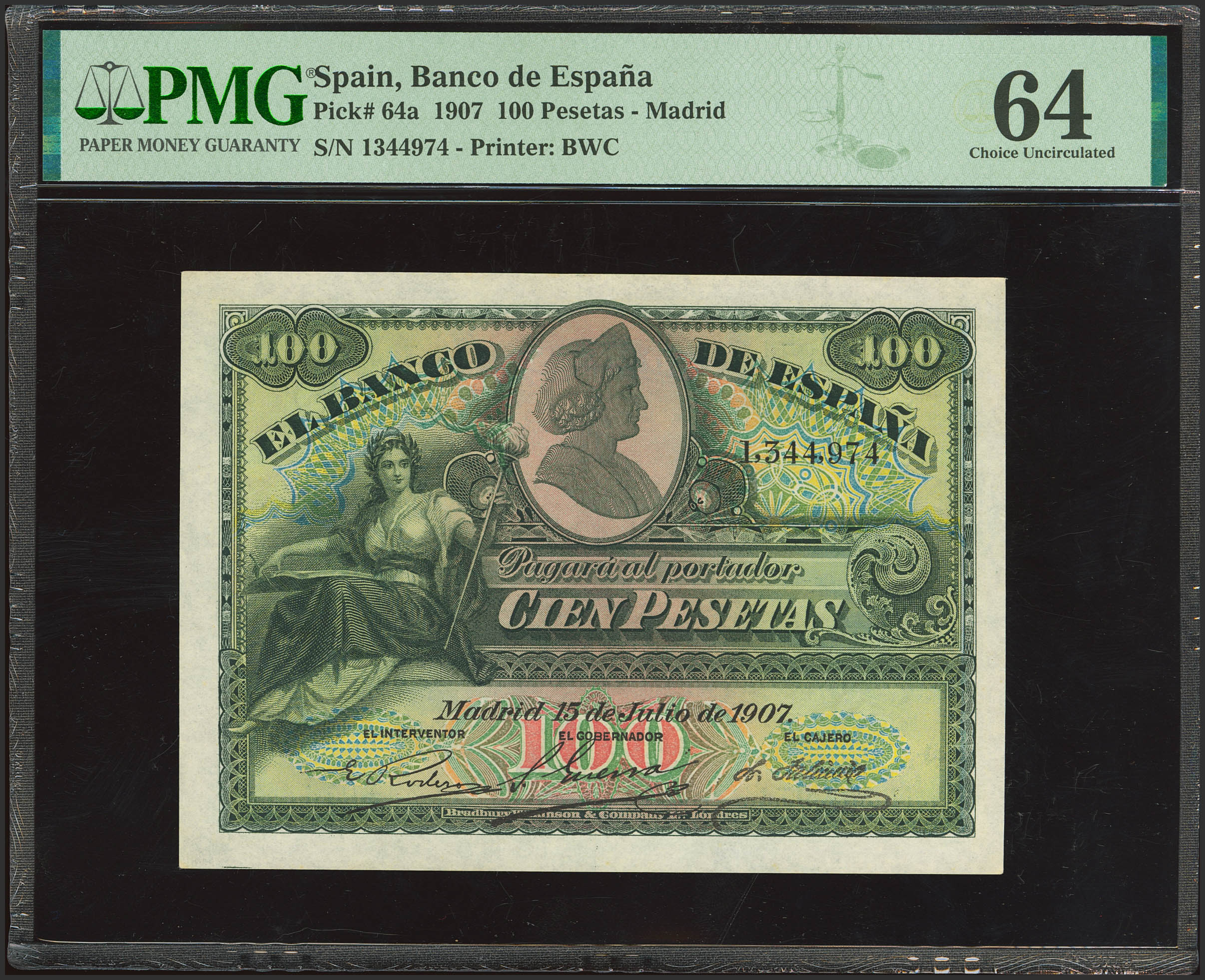 English 100 Pesetas. July 15, 1907. No serial number. (Edifil 2023: 320, Pick: 64a). Rare, especially in this condition. Uncirculated. PMG64 encapsulated.
