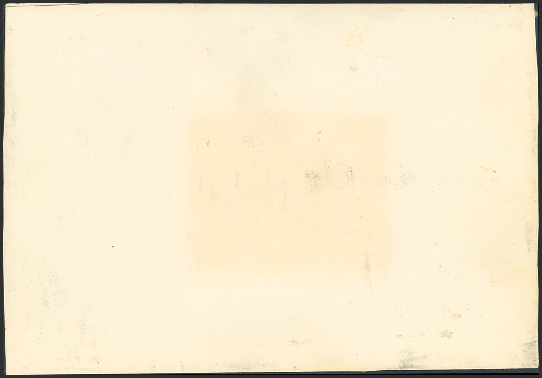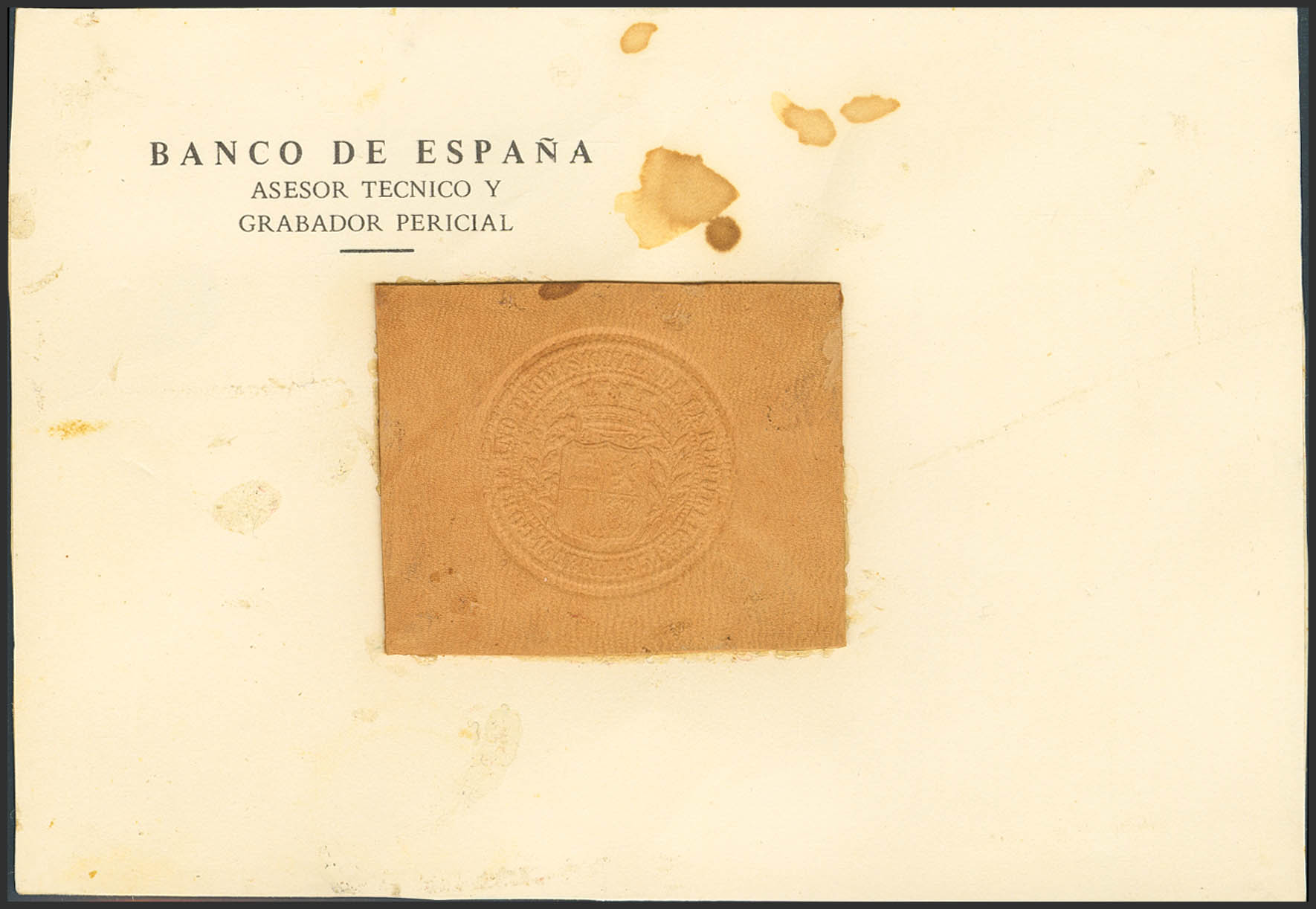 Blind stamp from 1931, PROVISIONAL GOVERNMENT OF THE REPUBLIC / APRIL 14, 1931, stamped on a fragment of leather and in turn on a small sheet of letterhead "BANK OF SPAIN TECHNICAL ADVISOR AND EXPERT ENGRAVER". Age stain. EF-.