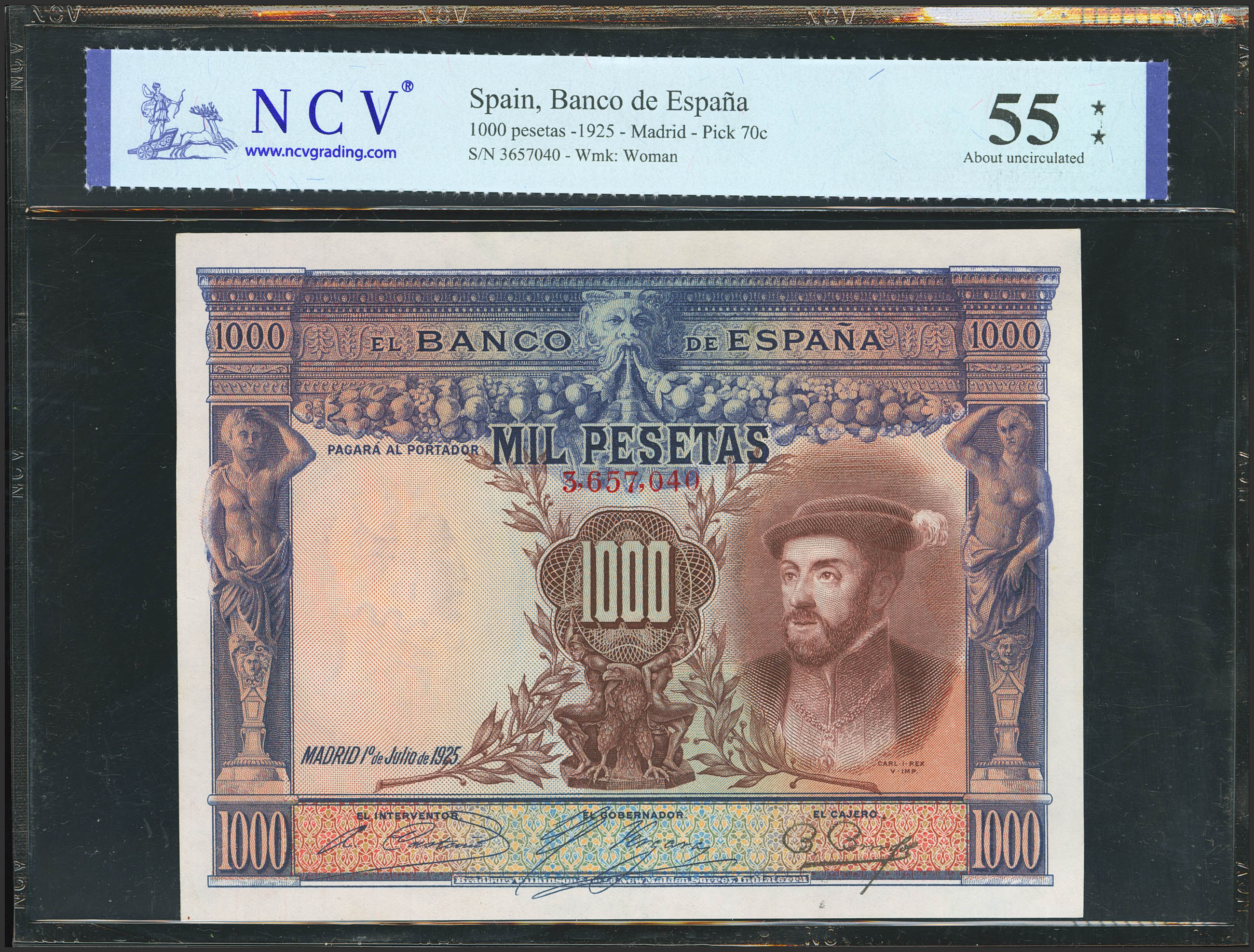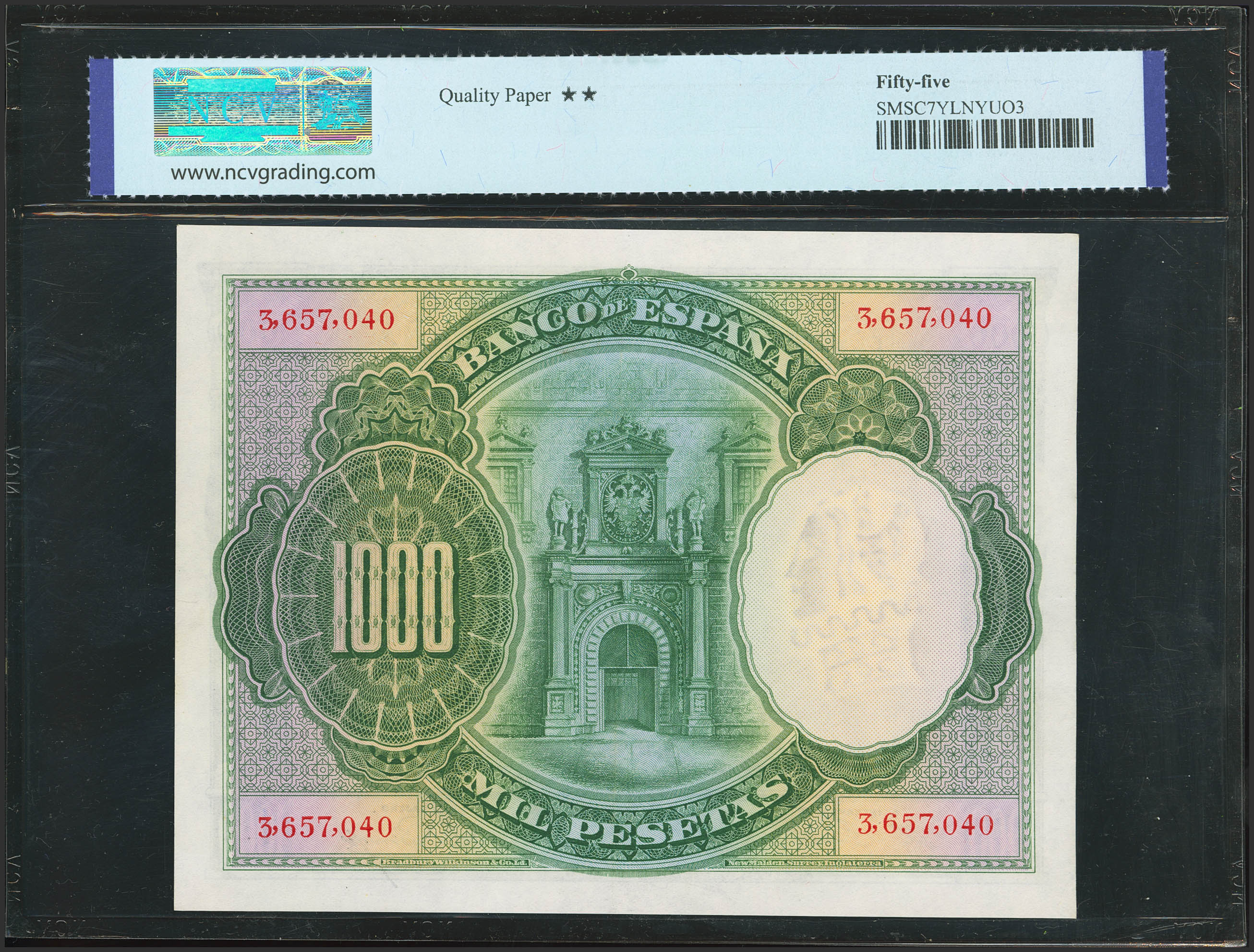1000 Pesetas. July 1, 1925. No serial number after 3646000. (Edifil 2021: 351, Pick: 70c). Unusual in this condition. Good Extremely Fine. NCV55 case.