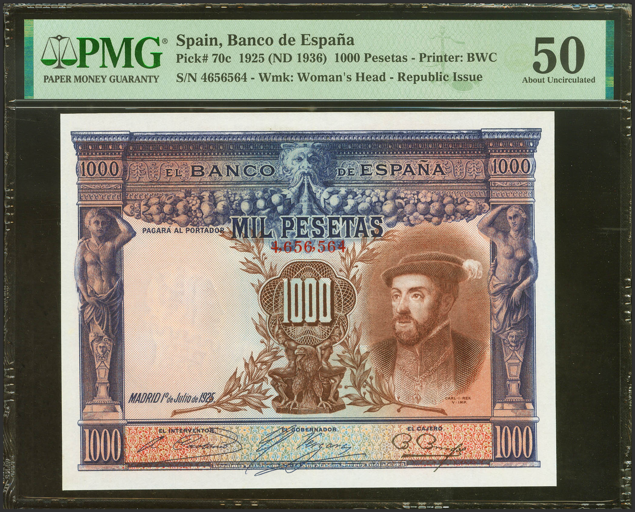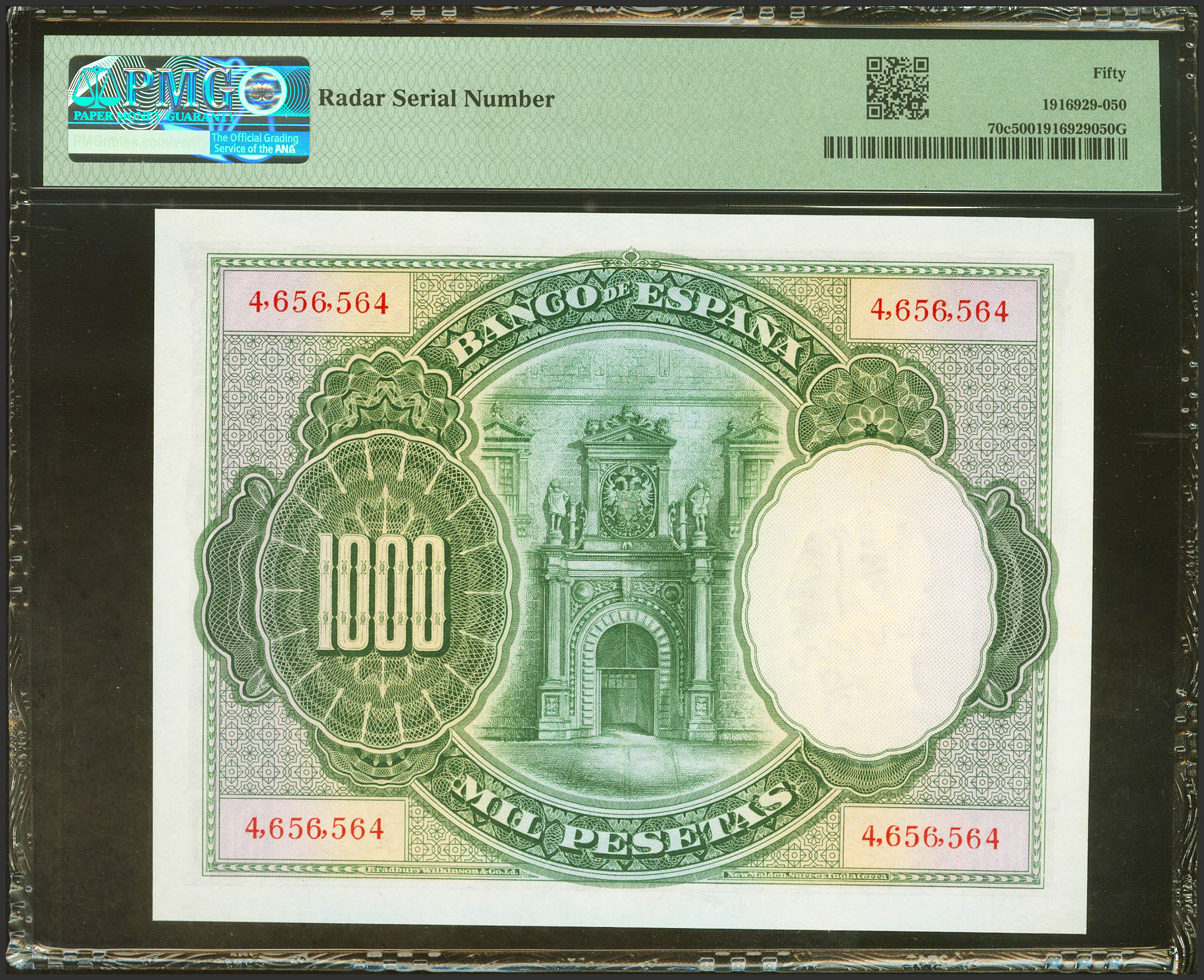 1000 Pesetas. July 1, 1925. No serial number and palindromic numbering after 3646000. (Edifil 2021: 351, Pick: 70c). Unusual in this condition. Extremely Fine. PMG50 (radar serial number) package.
