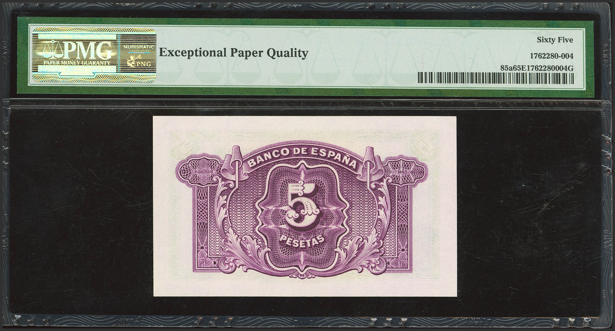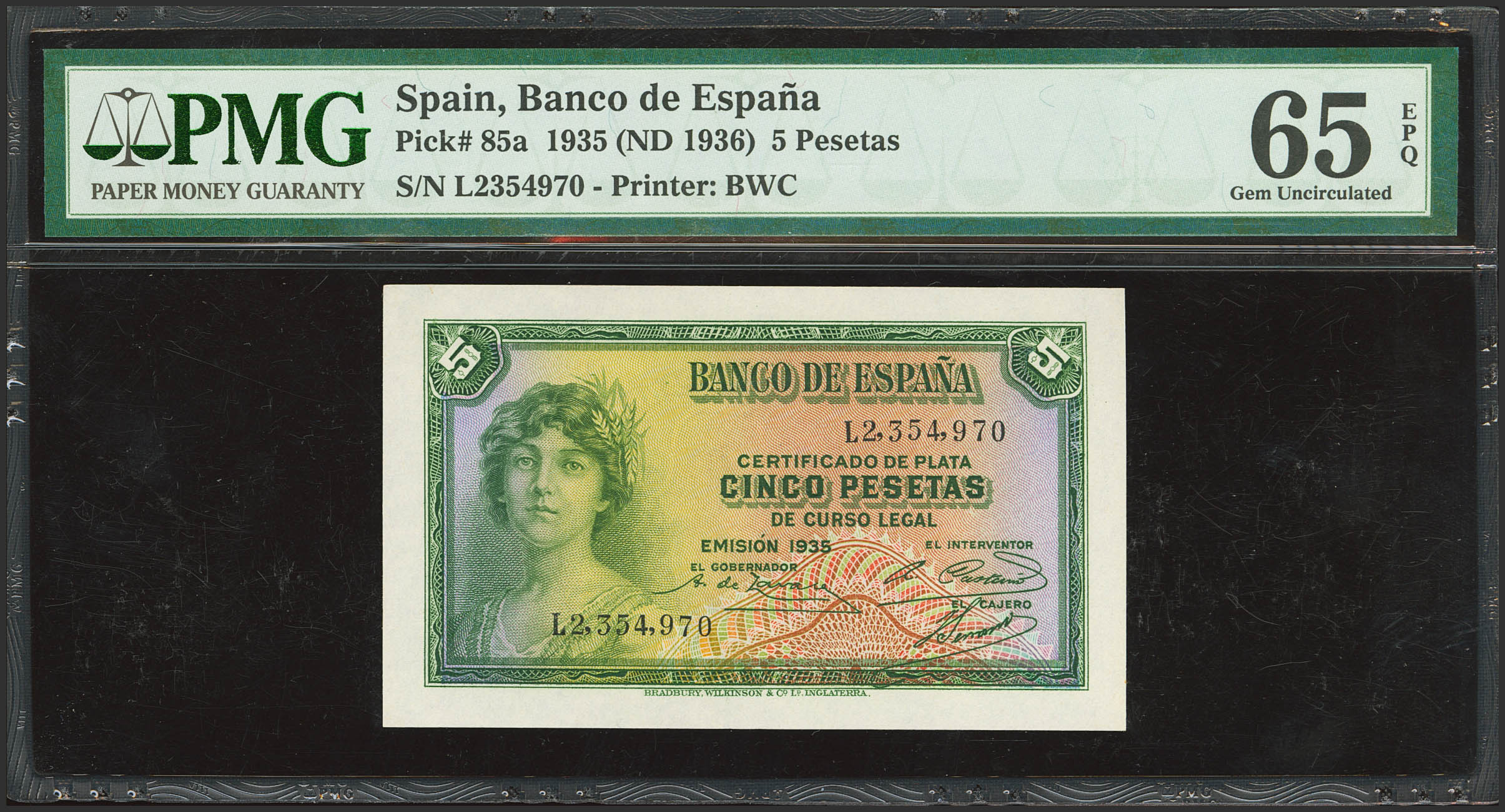 5 Pesetas. 1935. Silver Certificate. Series L, last series issued. (Edifil 2023: 363c, Pick: 85a). Original finish. Uncirculated. PMG65EPQ encapsulated.