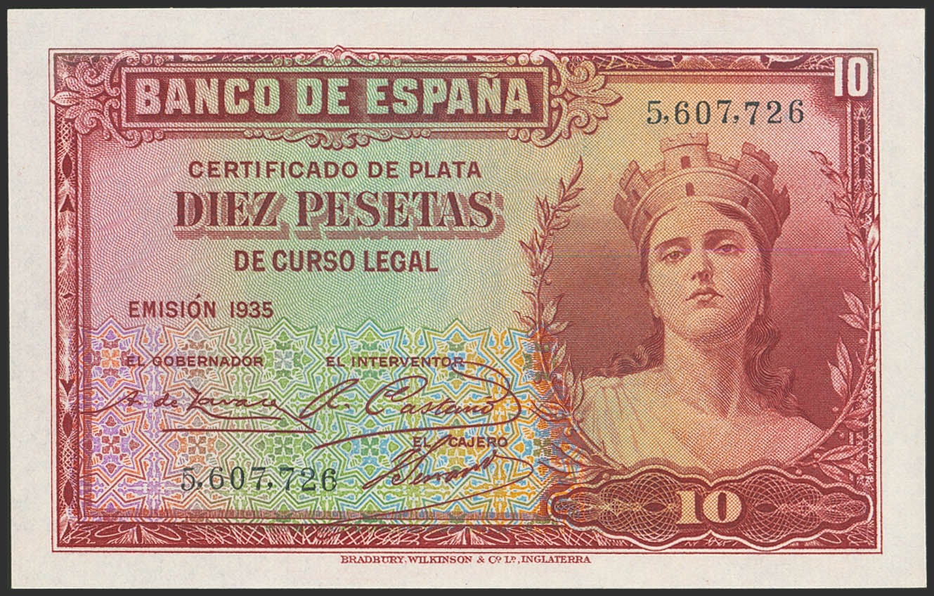 10 Pesetas. 1935. Silver Certificate. No serial number. (Edifil 2023: 364). Original finish. Uncirculated.