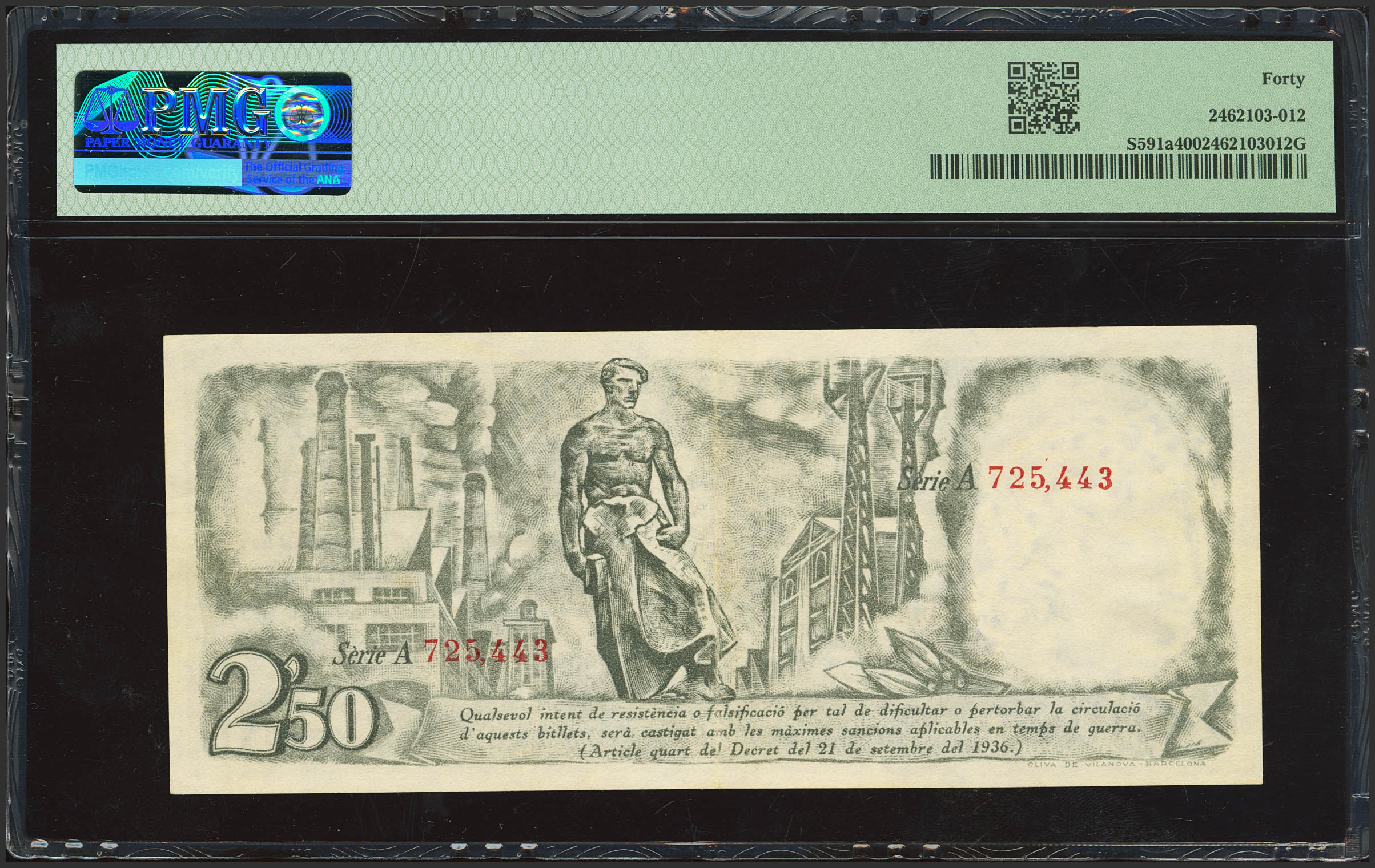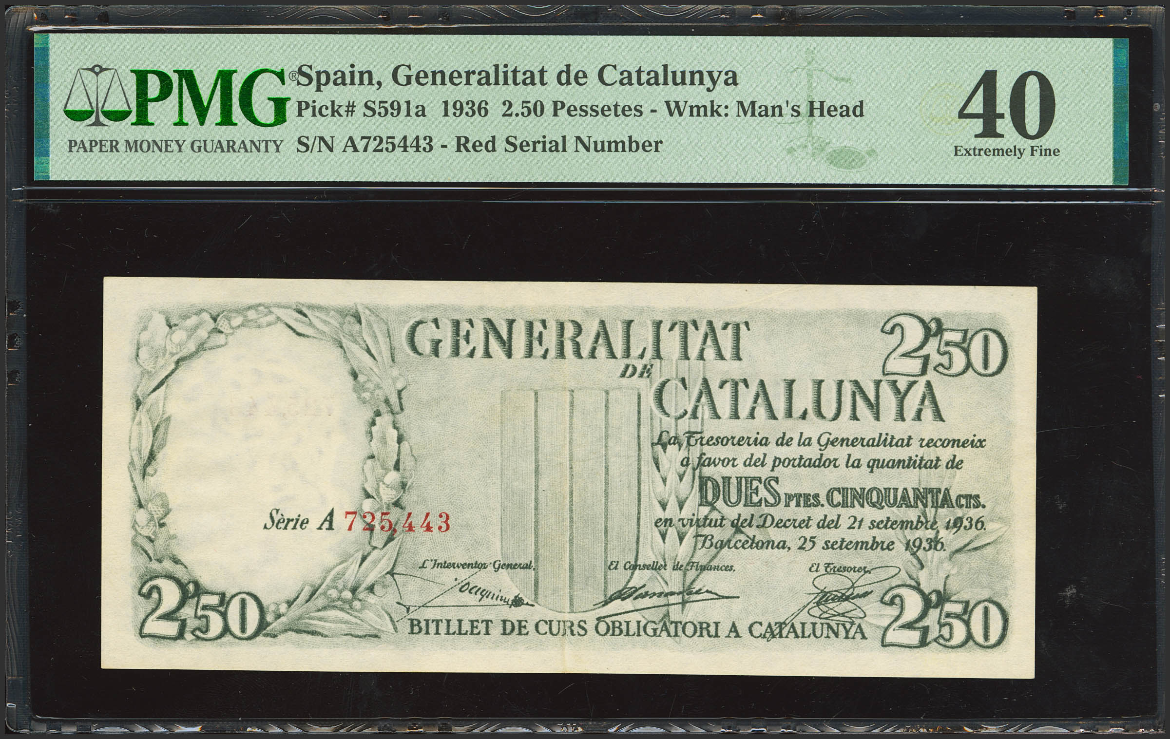 English 2.50 Pesetas. September 25, 1936. Generalitat de Catalunya. Series A, in red. (Edifil 2023: 372a, Pick: S591a). Unusual in this condition. EF-. PMG40 capsule.