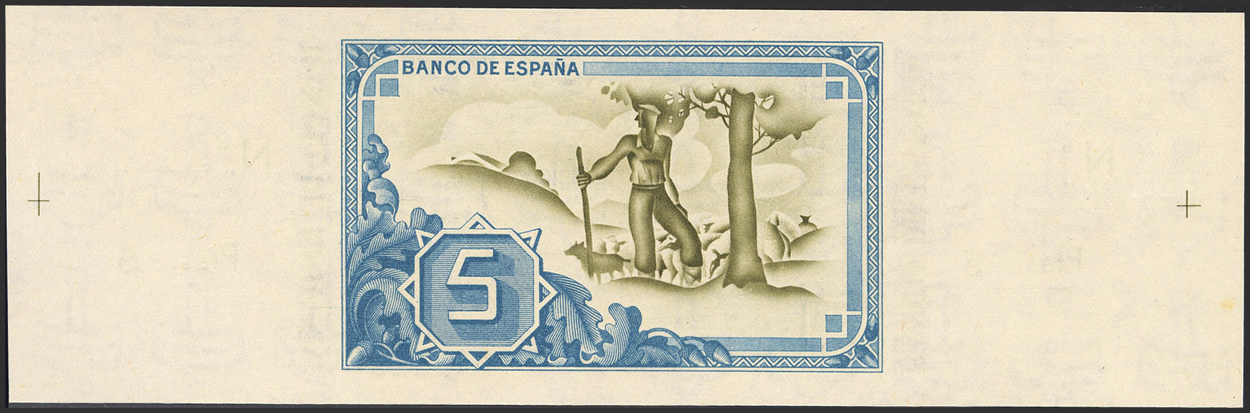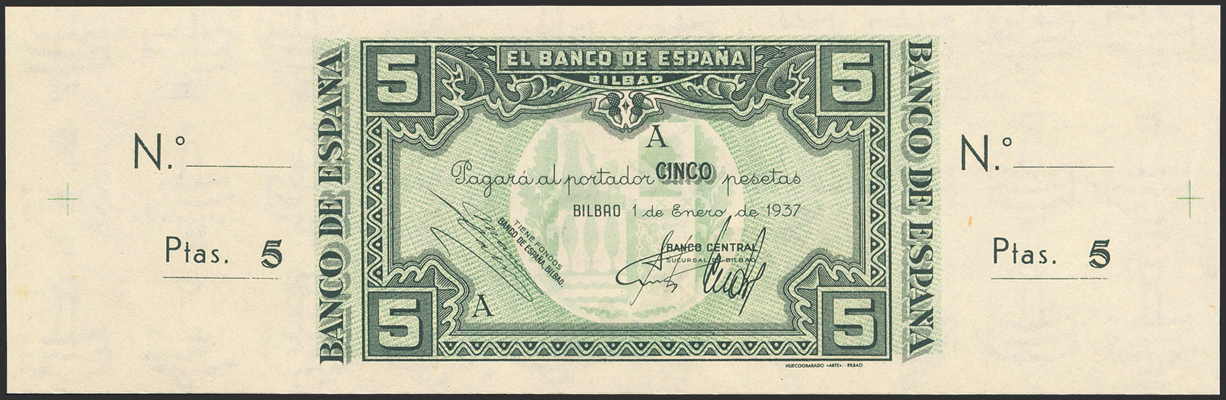 English 5 Pesetas. January 1, 1937. Bilbao Branch, Central Bank signature. Series A and unnumbered, with both matrices. (Edifil 2023: 386b). Original finish. Uncirculated.
