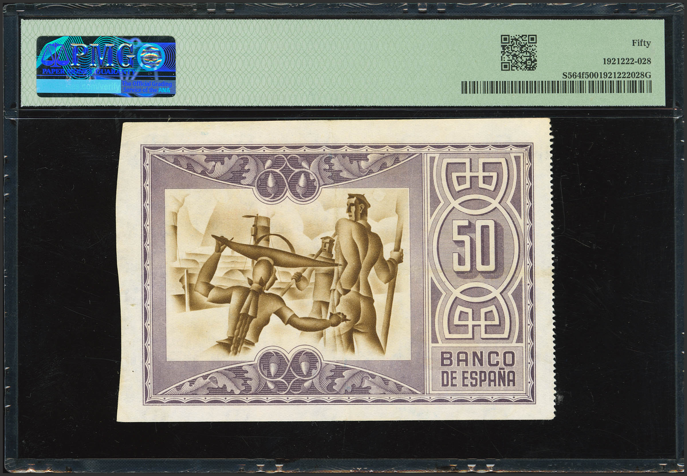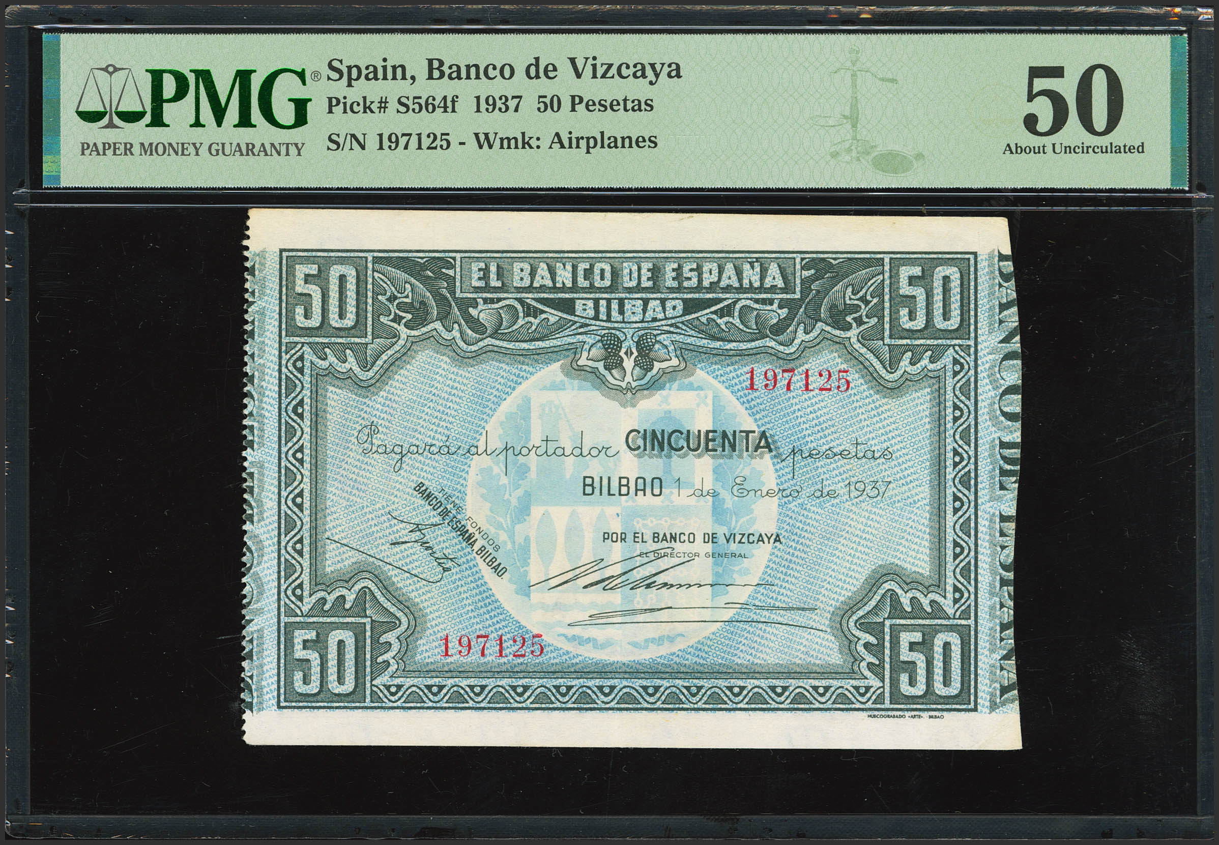 50 Pesetas. January 1, 1937. Bilbao branch, bank signature Banco de Vizcaya. No series, with serial number and without dies. (Edifil 2023: 389b, Pick: S564f). EF. PMG50 encapsulated.