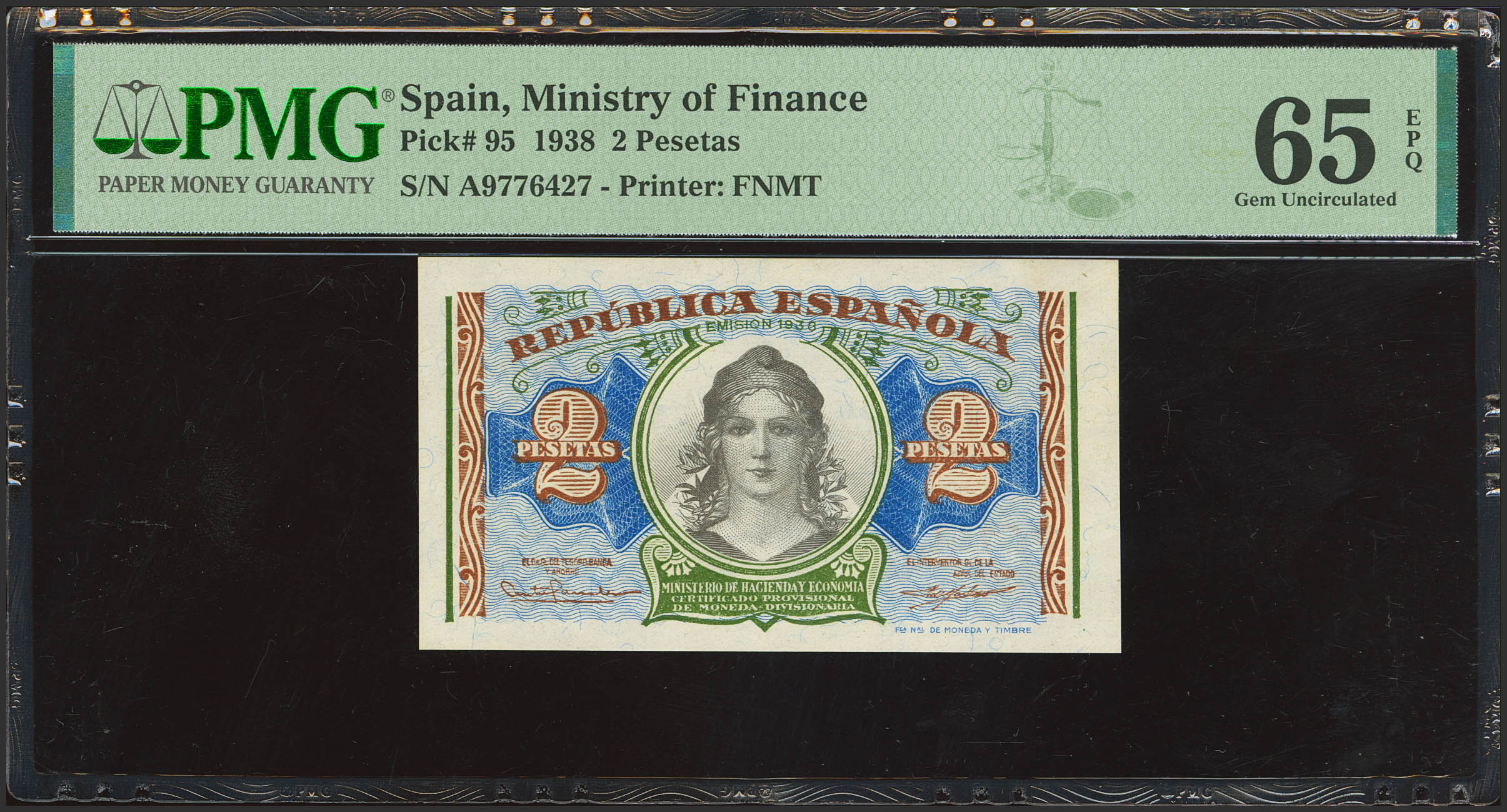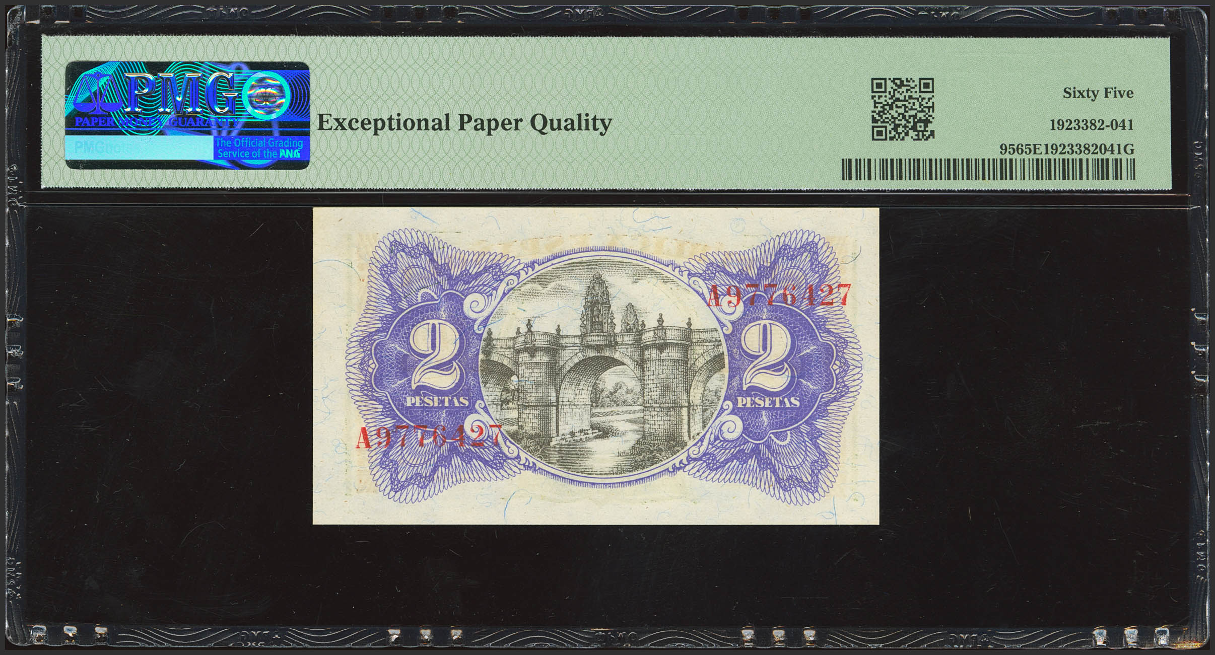 2 Pesetas. 1938. Series A. (Edifil 2023: 393, Pick: 95). Original finish. Uncirculated. PMG65EPQ encapsulation.