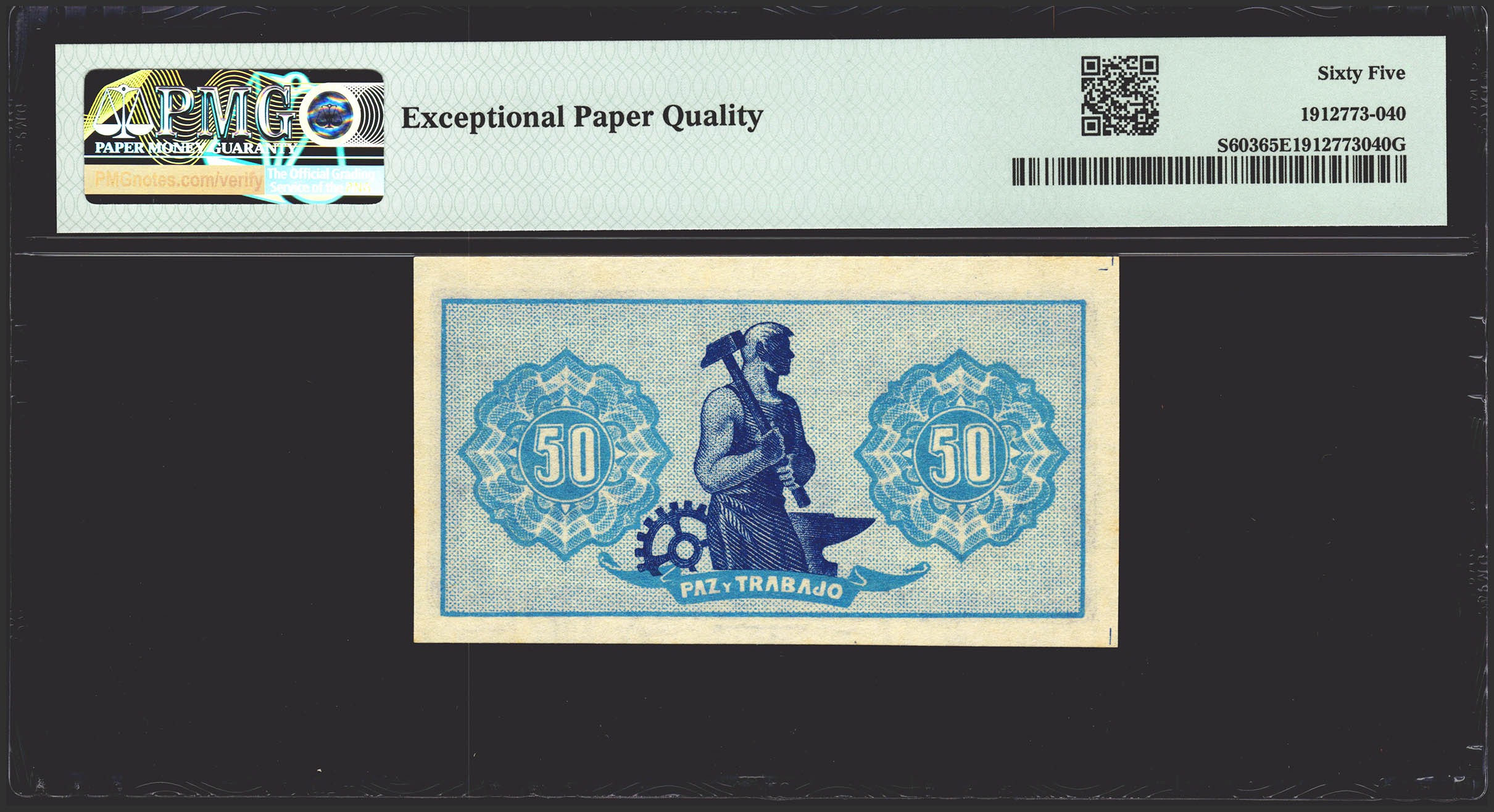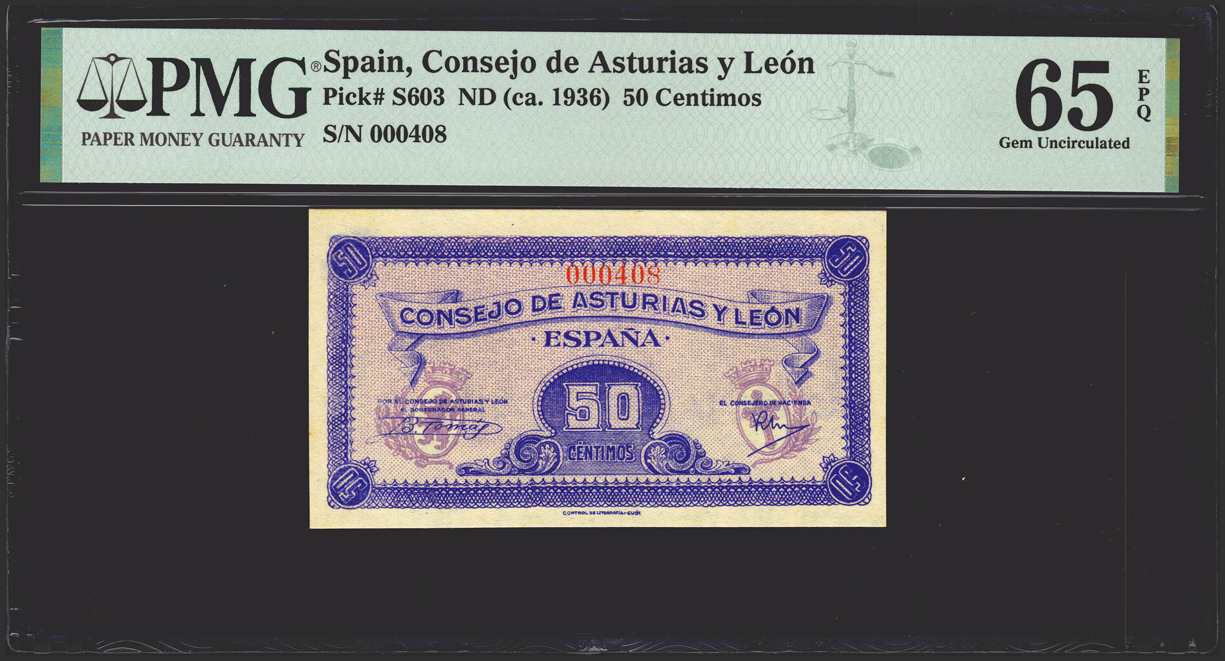 English 50 Centimos. 1937. Asturias and León. No series and very low serial number. (Edifil 2021: 396, Pick: S603). Extremely rare, especially in this exceptional condition, original finish. Uncirculated. Encapsulated PMG65EPQ.