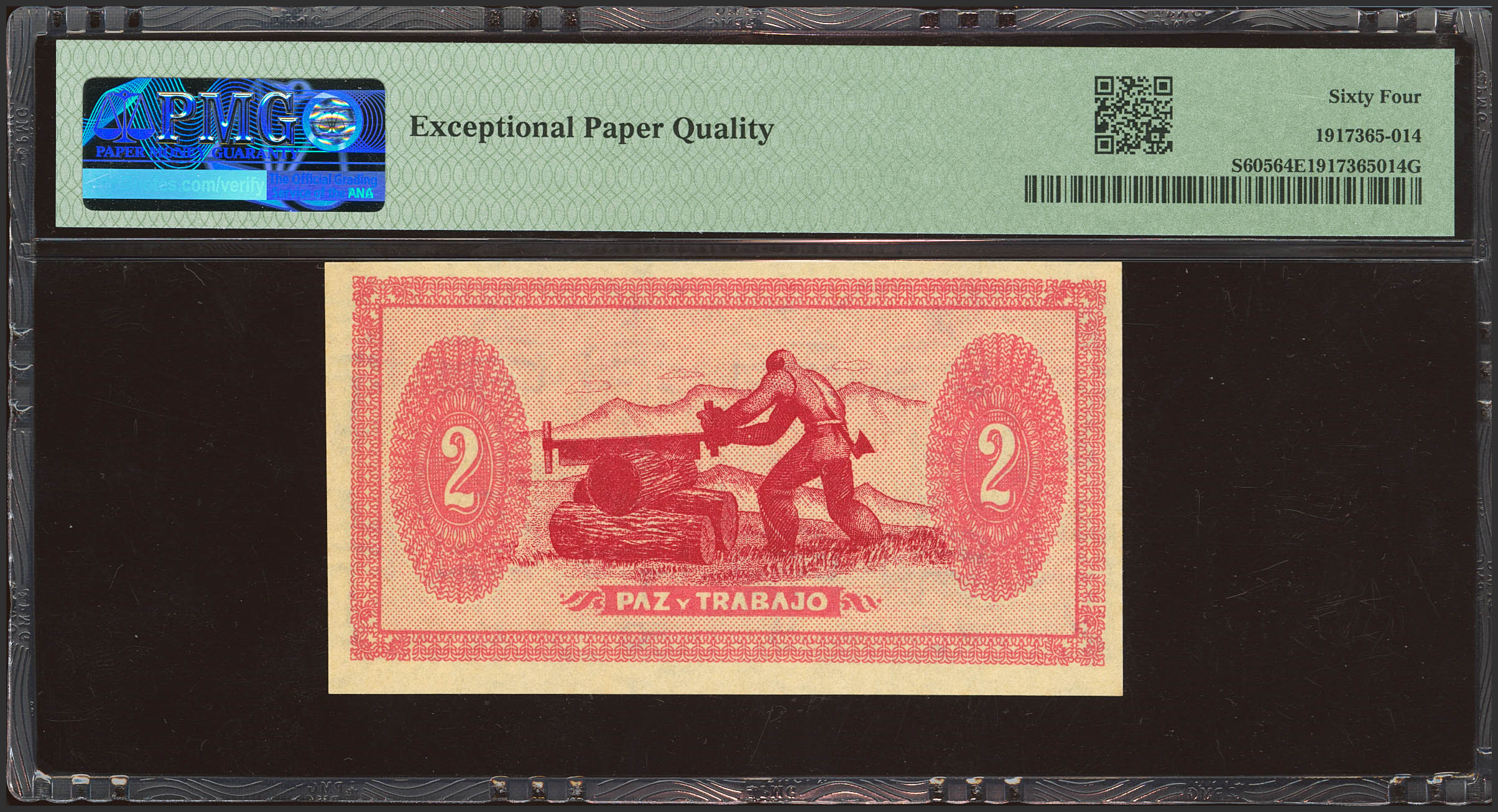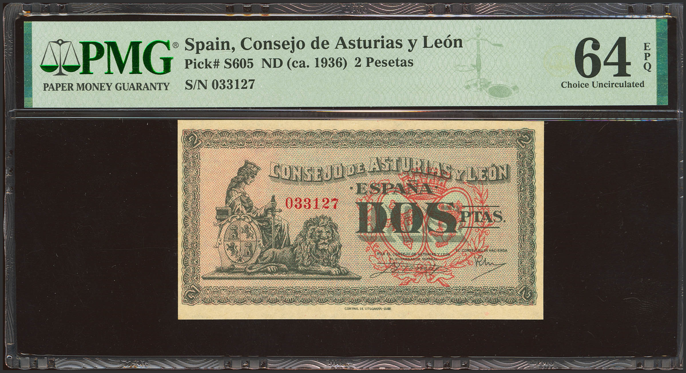 2 Pesetas. 1937. Asturias and León. No serial number. (Edifil 2021: 398, Pick: S605). Original finish. Uncirculated. PMG64EPQ encapsulated.