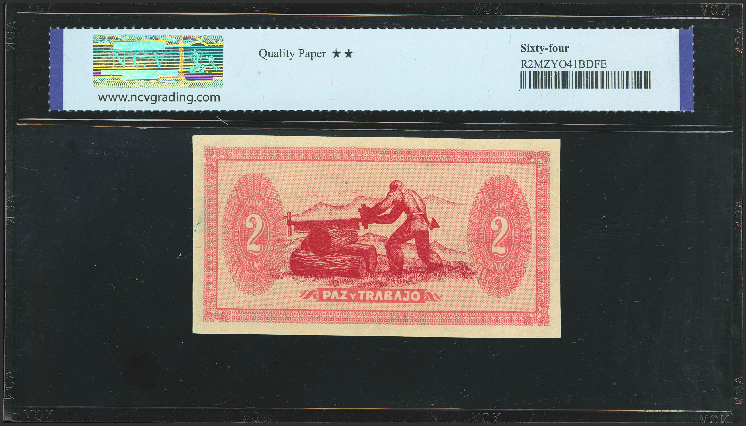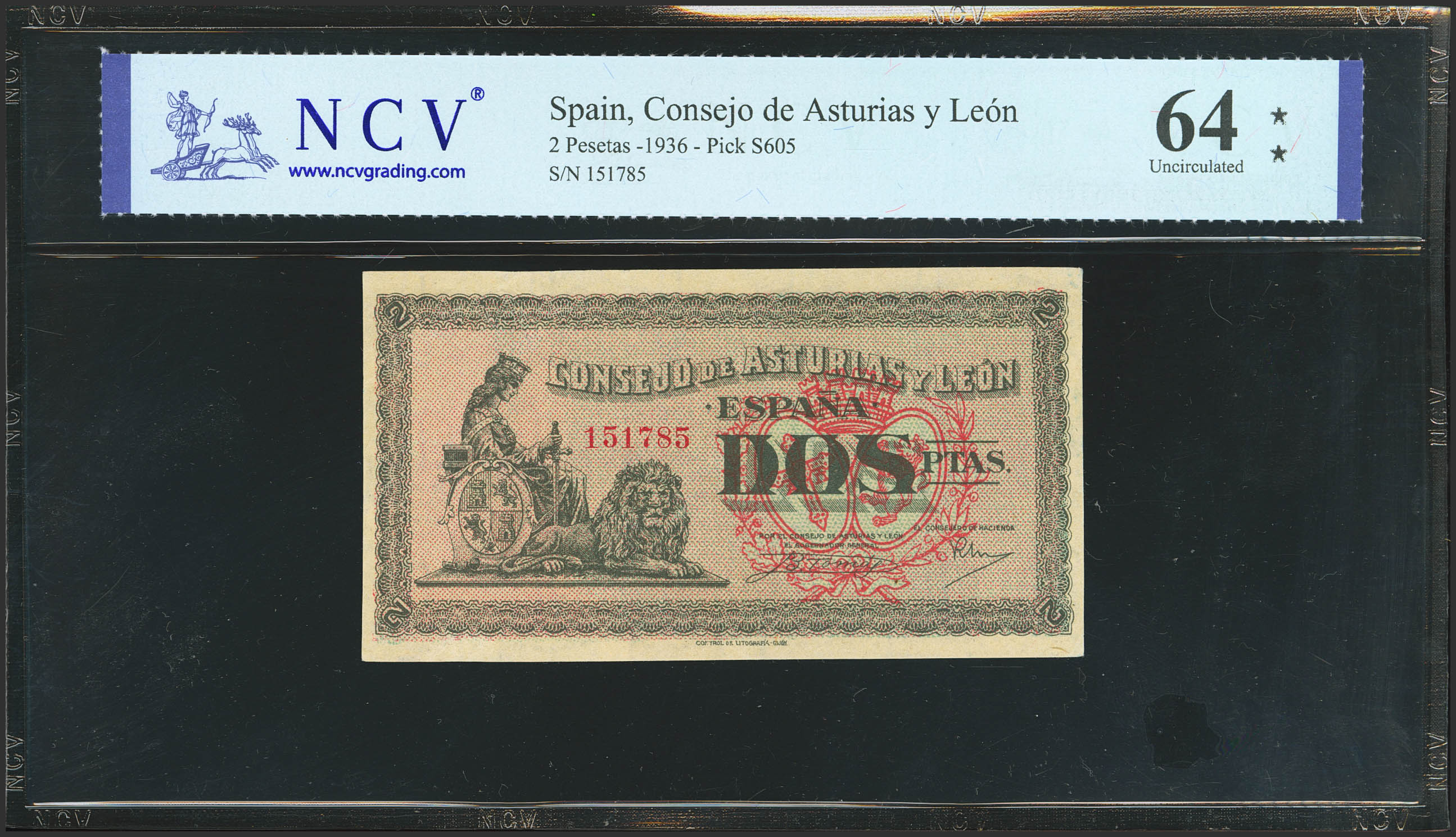 English 2 Pesetas. 1937. Asturias and León. No serial number. (Edifil 2021: 398, Pick: S605). Uncirculated. NCV64 encapsulation.