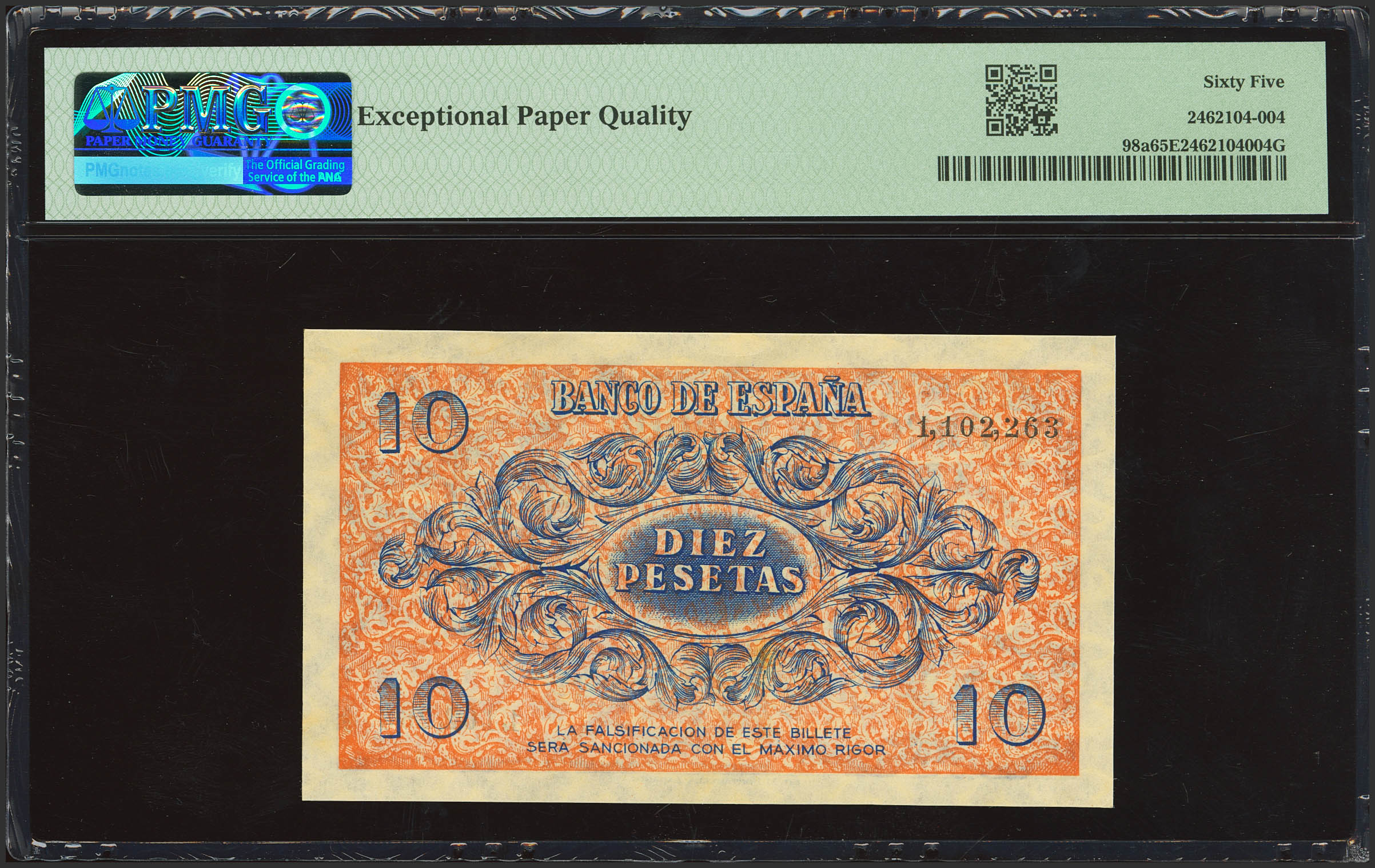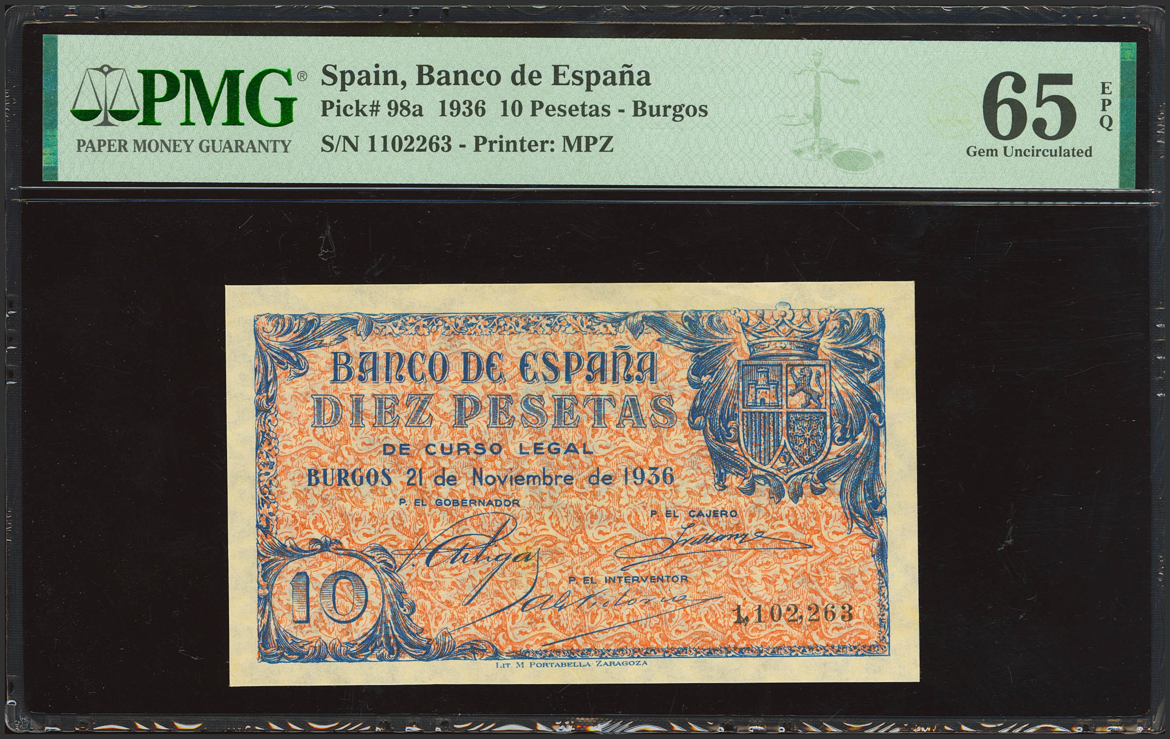 English 10 Pesetas. November 21, 1936. No serial number. (Edifil 2023: 418, Pick: 98a). Extremely rare, original finish. Uncirculated. Encapsulated PMG65EPQ. (To give an idea of its rarity, as of October 1, 2025, this is the second-highest grade for this series in PMG.)