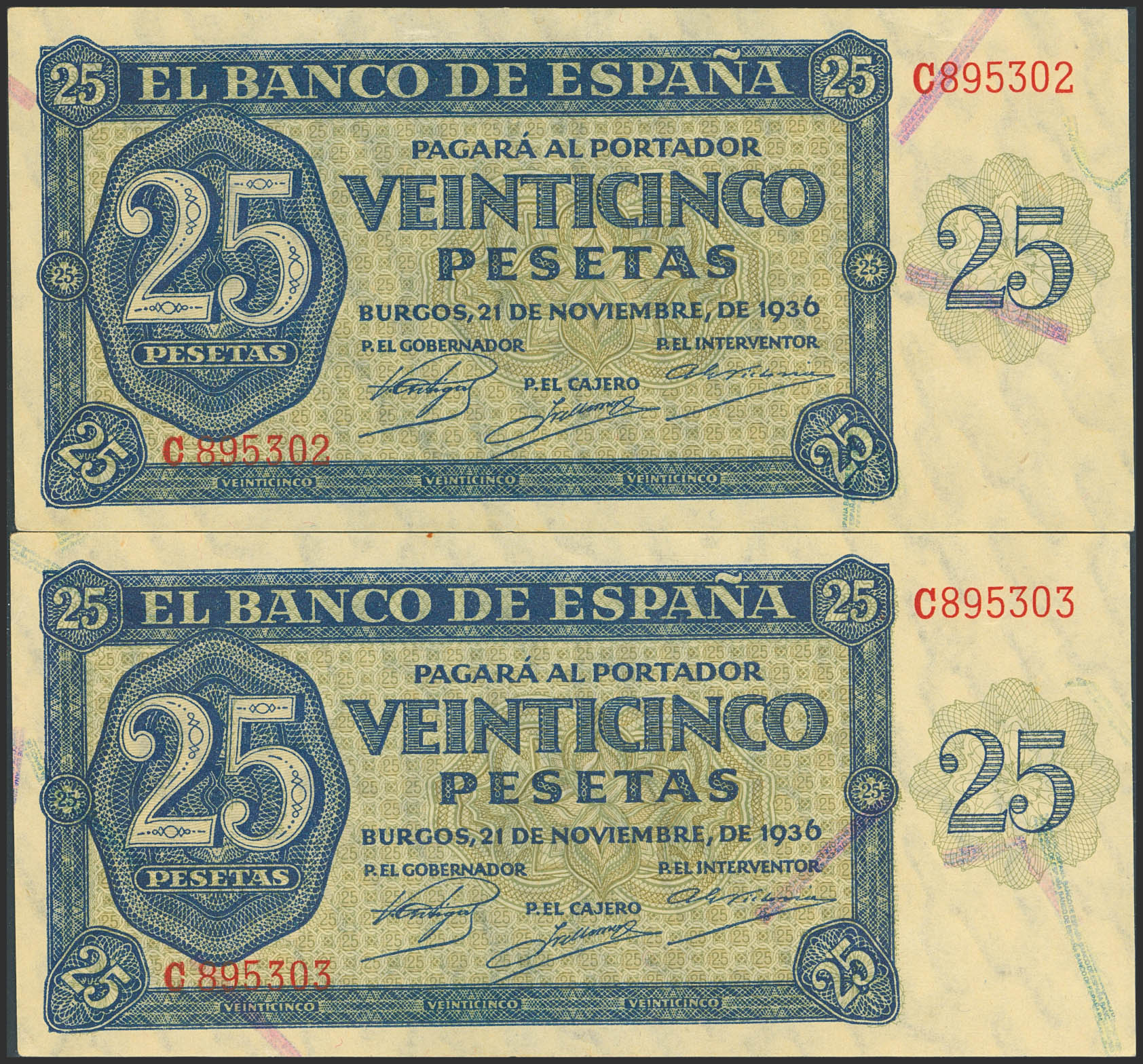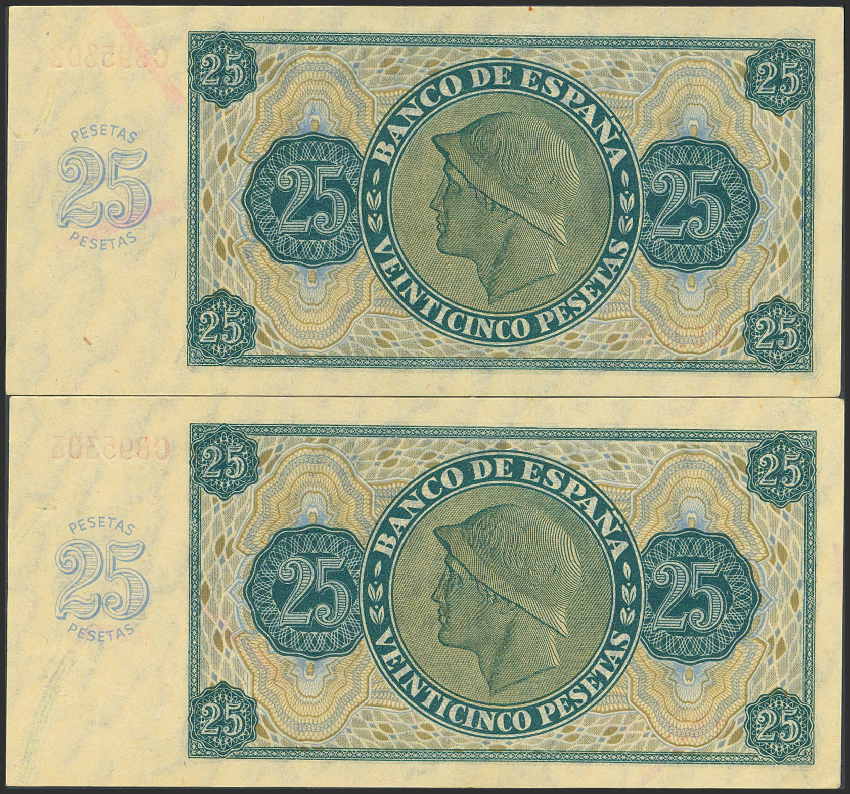 25 Pesetas. November 21, 1936. Consecutive pair. Series C. (Edifil 2023: 419a). Original finish. Uncirculated-.