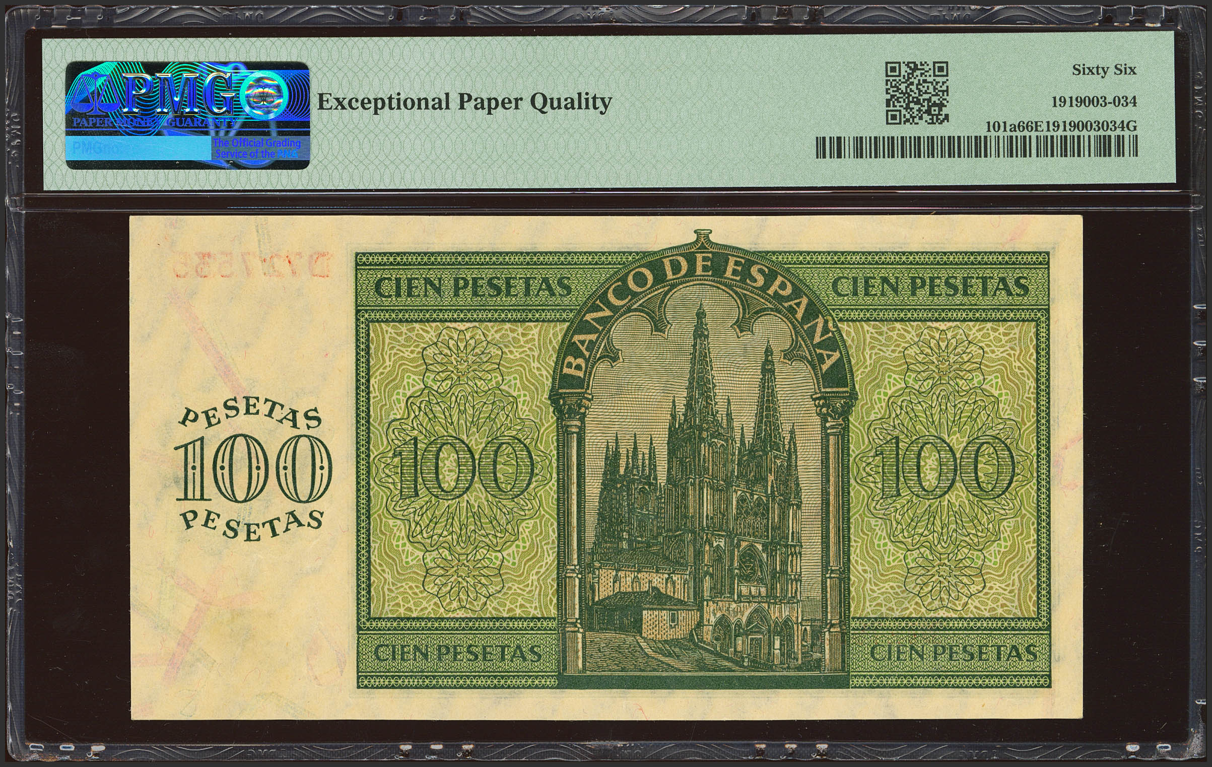 100 Pesetas. November 21, 1936. Series D. (Edifil 2023: 421a, Pick: 101a). Rare in this exceptional condition, original finish. Uncirculated. Encapsulated PMG66EPQ.