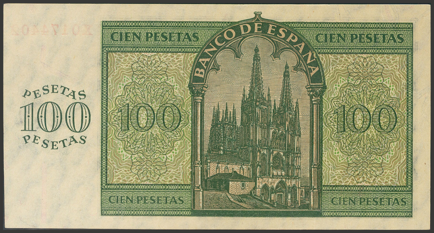 100 Pesetas. November 21, 1936. Series X, last series issued. (Edifil 2017: 421a). Original condition. Uncirculated-.