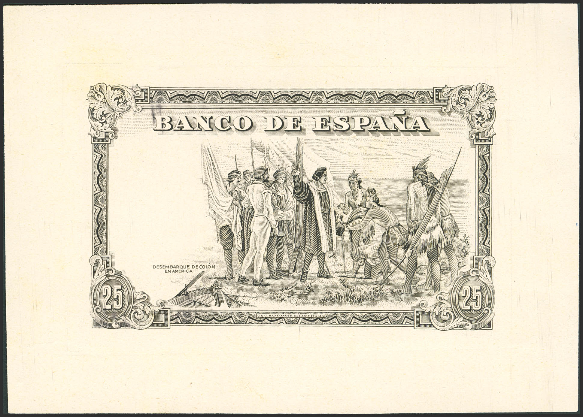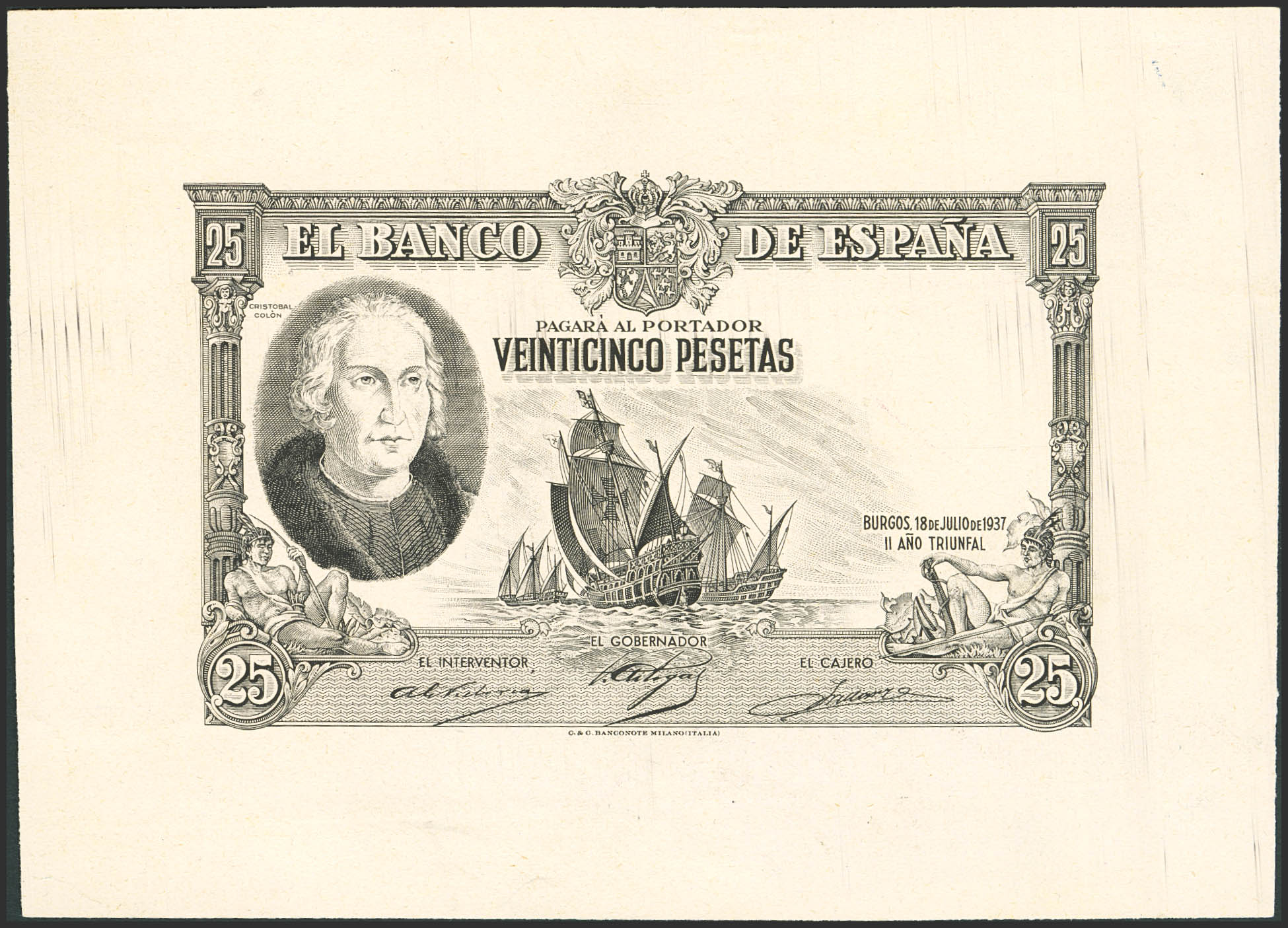English 25 Pesetas. July 18, 1937. No series. Intaglio proofs of the obverse and reverse of a banknote that was never put into circulation, with signatures. (Edifil 2023: NE41P, Cobo: 16c, 16d). Exceptionally rare and a spectacular piece, especially as it is an unissued banknote. Uncirculated.